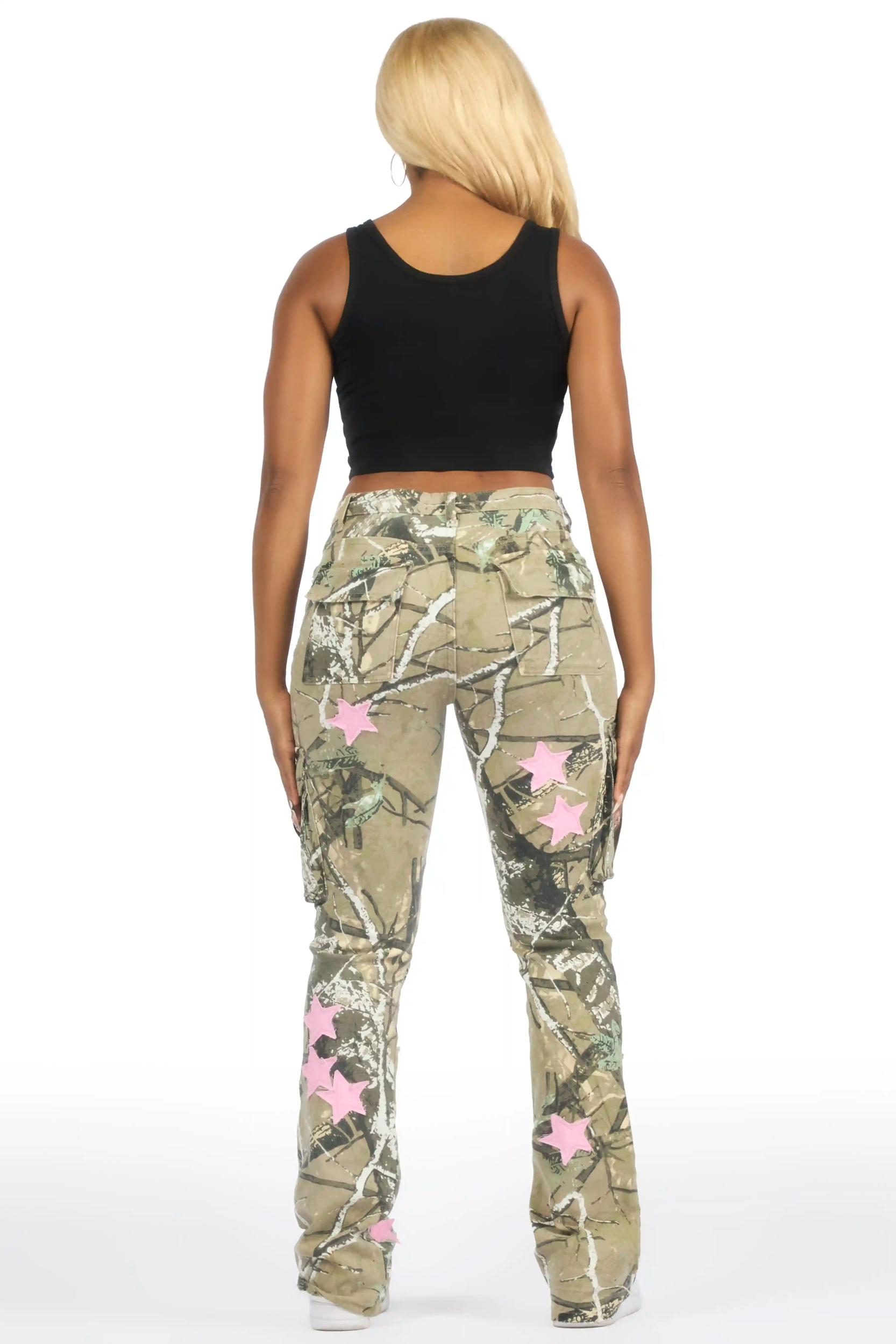 An urban stacked flare jean for women in tree camo. Designed with premium fabric and extra long legs for a must-have streetwear style. Zip fly with button closure 7-pocket build High-waisted silhouette Fitted through the hip Distressed detailing Frayed seams Custom RSO patchwork Flare leg openings Stacked construction 36" inseam NOTE: These jeans are purposefully designed with extra long legs so the fabric properly bunches at the hem, creating the stacked flare style.