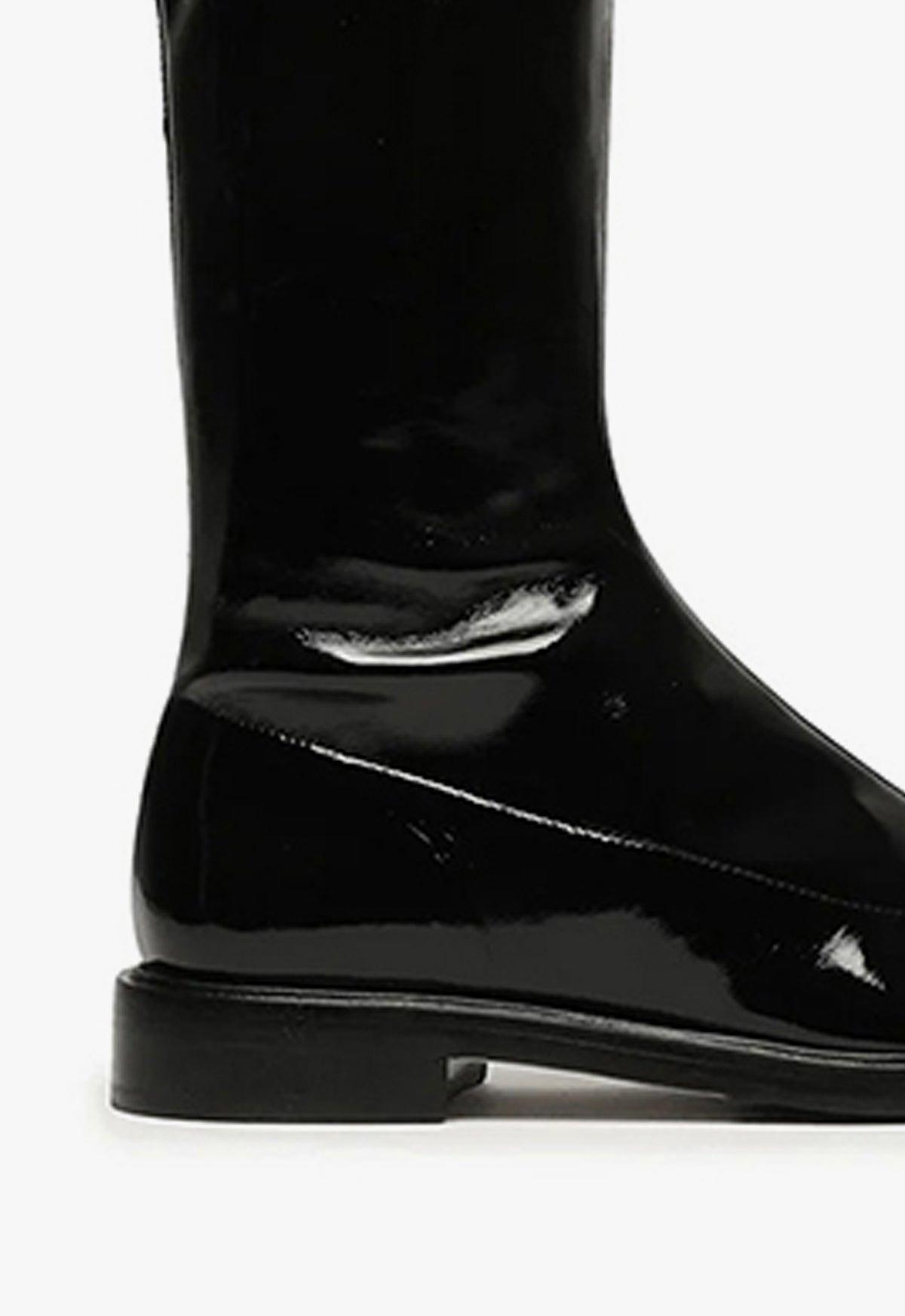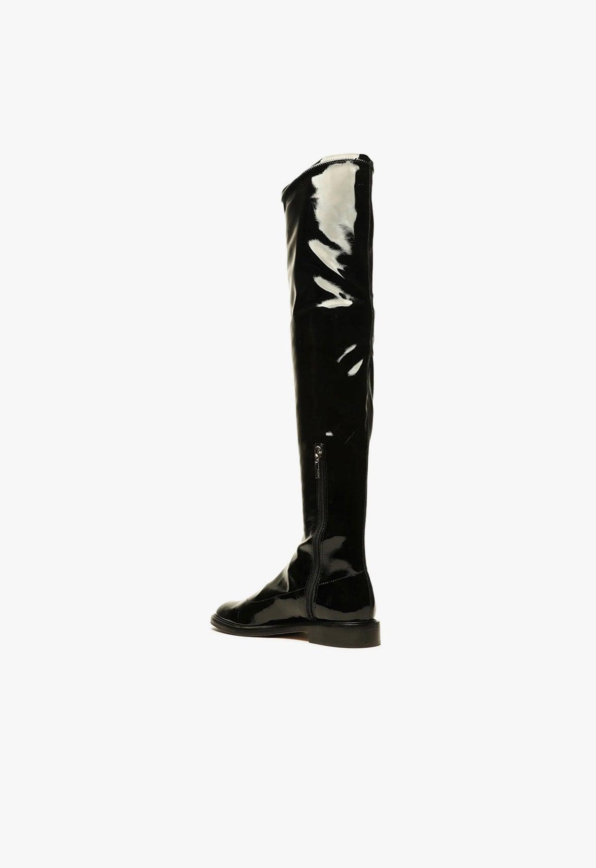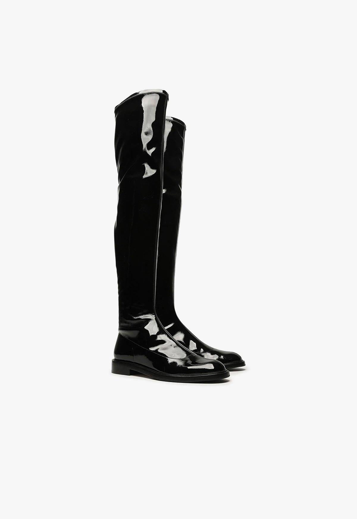 Elevate your style effortlessly with the Kaolin over-the-knee boot – a masterpiece in stretchy patent leather. Experience a fusion of fashion and convenience like never before. Materials: Patent Leather | Cow leather lining | Cow leather outsole Upper format: Skinny Upper Detail: Embellished upper Heel Type: Flat Heel Heel Style: Flat heel Closure Type: Slip-on Toe Style: Round toe Counter Type: Closed Shaft Circumference: 15.76in | 394mm Shaft Height: 25in | 625mm Platform Height: 15mm Heel Height: 1.2in | 30mm SKU: S2106700030002 This style runs big; we suggest ordering half size down