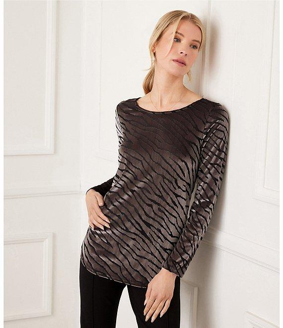 From Karen Kane, this top features: Velvet burnout fabrication Scoop neckline Long sleeves Abstract zebra inspired pattern Curved shirttail hem Pull over construction Approx. 25.25" length Polyester/nylon/spandex Hand wash cold/ hang to dry Imported.