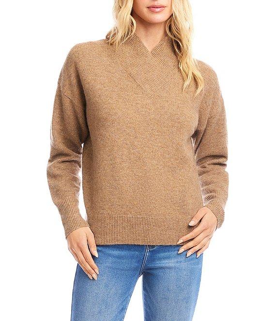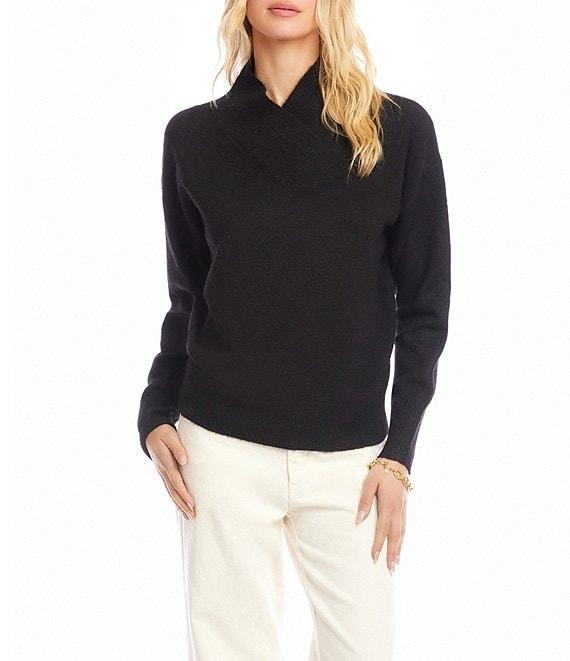From Karen Kane, this top features: Soft knit fabrication Crossover v-neckline Shawl collar Long sleeves Ribbed cuffs and hemline Pullover construction Approx. 22.5" length Recycled polyester/polyester/wool/spandex Hand wash cold/flat dry or dry clean Imported.