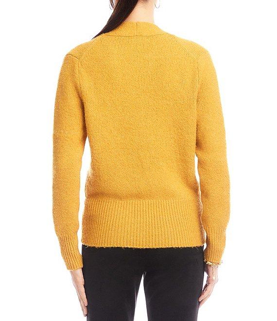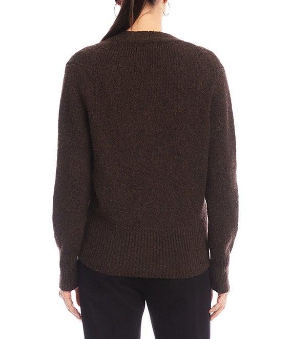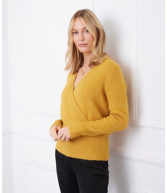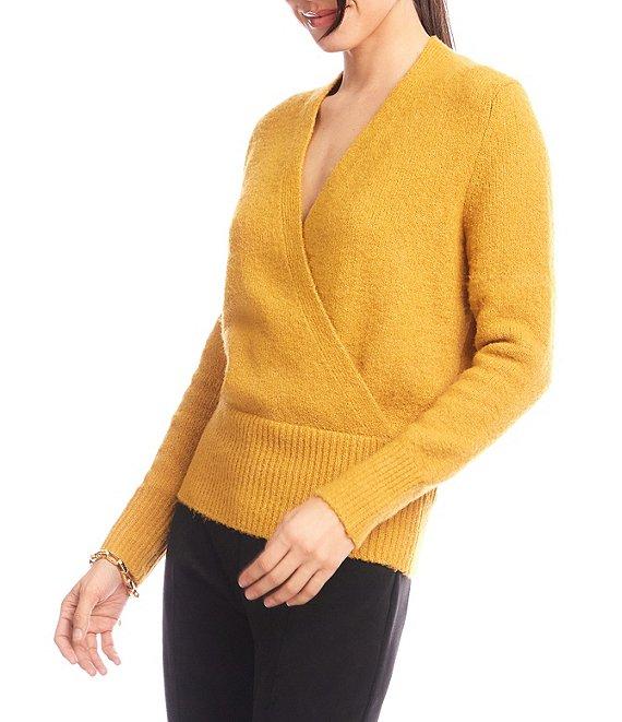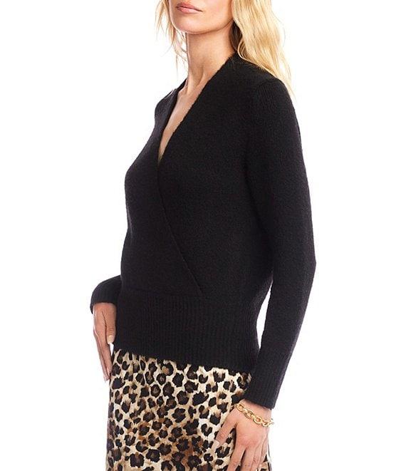 From Karen Kane, this top features: Knit fabrication Faux wrap silhouette V-neckline Subtle drop shoulders Long sleeves Wide ribbed edge detailing at hem and cuffs Pullover construction Approx. 23.75" length Acrylic/polyester/spandex Dry clean Imported.