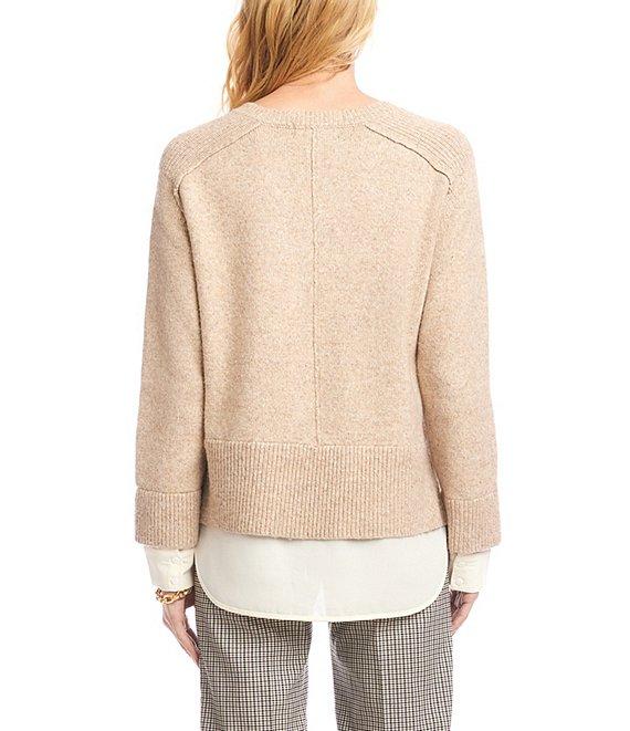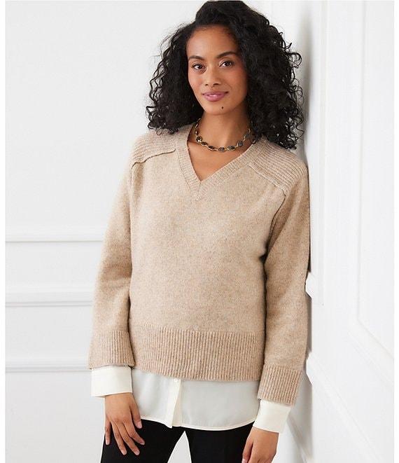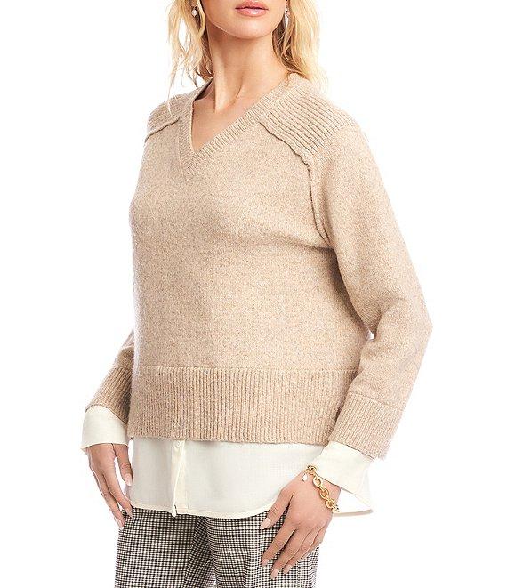 From Karen Kane, this top features: Soft knit fabrication Layered silhouette V-neck Long sleeve Shoulder detailing Built in underlayer peeks out cuffs hem Wide ribbed hem and cuffs Pull-over construction Approx. 26.50" length Polyester/acrylic/nylon/wool/cotton Machine wash cold/flat dry Imported. Karen Kane Layered V-Neck Sweater Featuring a soft knit texture, subtle shoulder detailing, and a wide ribbed hem and cuffs. A built-in woven underlayer peeks out at the hem and cuffs, giving the look of a perfectly styled shirt-and-sweater combo without the bulk. Ideal for workdays or weekends.