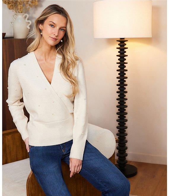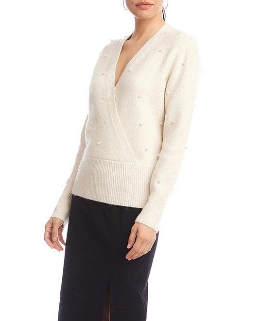 From Karen Kane Petite, this sweater features: Wool blend fabrication Faux wrap silhouette V-neckline Long sleeves Faux pearl embellishments Ribbed hemline Pull over construction Approx. 21.75" length Polyester/acrylic/nylon/ wool/spandex Hand wash cold/ dry flat Imported. Elegant and feminine, this long-sleeve sweater features a faux-wrap design with a deep V-neckline and pearl embellishments throughout. Crafted with minimal wool for a soft, lightweight feel and finished with a ribbed hem. Pull-on style for easy wear.