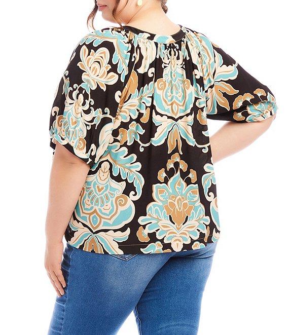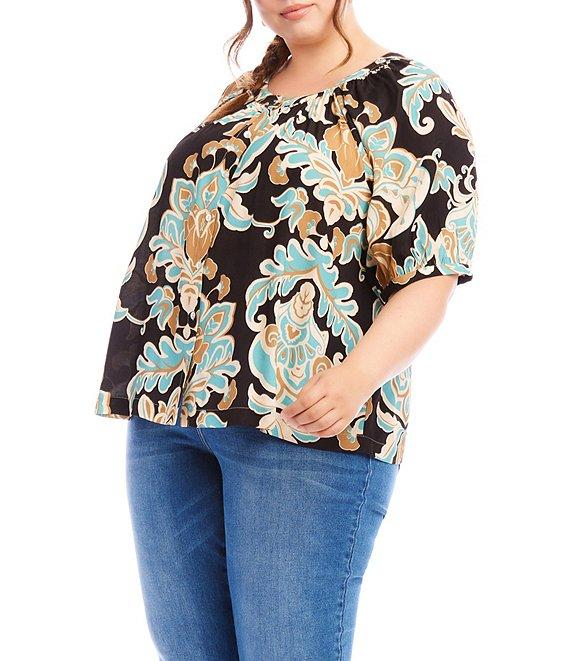 From Karen Kane Plus, this top features: Scoop neckline Short puff sleeves Floral print Straight hemline Button-front closure Approx. 28.5" length Viscose Hand wash or dry clean Imported. This peasant top is made of crepe material and features a beautiful blue and soft brown flower print. Its relaxed fit provides comfort and style for a casual look. Perfect for any occasion, this top is a versatile addition to your wardrobe.