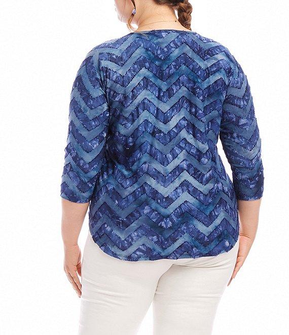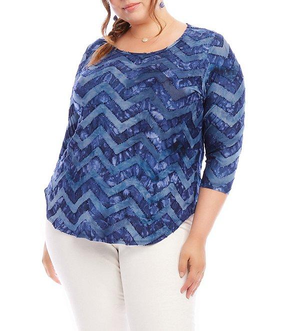 From Karen Kane Plus, this top features: Jacquard burnout fabrication Scoop neckline 3/4 sleeves Tie-dye print Shirttail hemline Pullover construction Approx. 29" in length Polyester/rayon/spandex; unlined Hand wash cold separately; lay flat to dry Hand wash or dry clean Imported. Karen Kane Plus Size Tie Dye Burnout Shirttail Top Experience ultimate comfort and style with our Tie Dye Burnout Shirttail Top. The unique zig zag tie dye print and jacquard burnout textured material add a touch of sophistication to its casual look. Made from stretchy fabric, this top ensures a perfect fit for all-day wear.