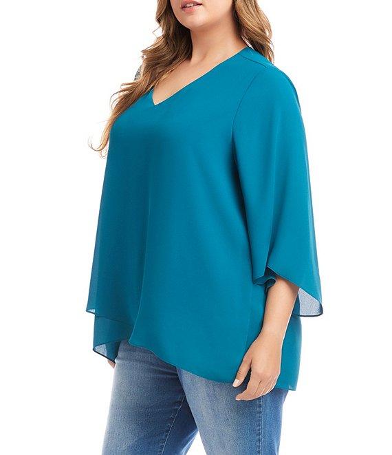 From Karen Kane Plus, this top features: Silky crepe fabrication V-neckline 3/4 sleeves Crossover hemline Pullover construction Approx.30" in length Polyester Hand wash/line dry Made in USA of imported fabric. This Bracelet Sleeve Asymmetric Top is made from silky crepe material for an elegant and comfortable feel. The flowy, layered hem adds a touch of movement, perfect for a day at work or a casual night out.