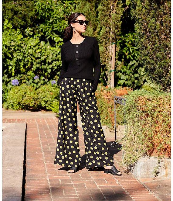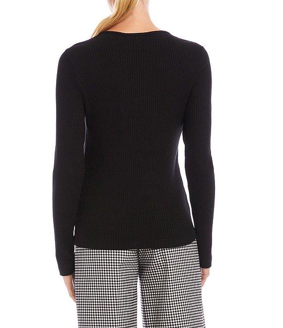 From Karen Kane, this top features: Ribbed knit fabrication Hand-painted flower shaped buttons Crew neckline Long set-in sleeves Front button placket Straight hemline Pullover construction Approx. 23.25" length Viscose/spandex Hand wash cold/dry flat Made in the USA.