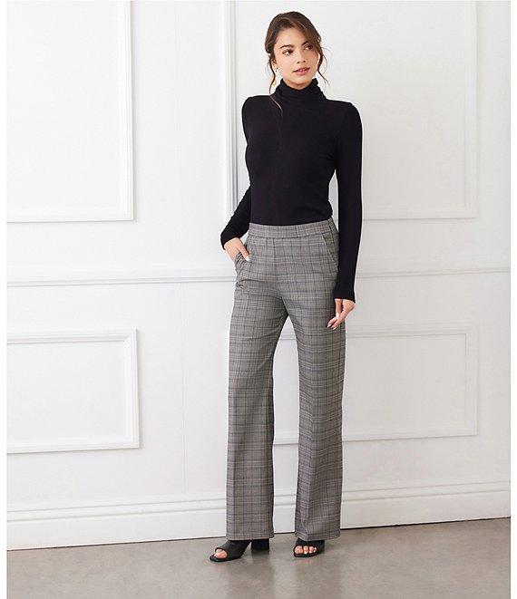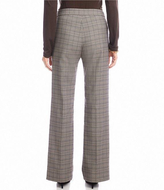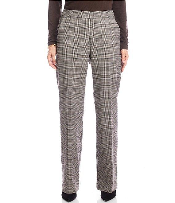 From Karen Kane, these trousers feature: stretch woven plaid fabrication Straight leg silhouette High rise Full length 2 functional side seam pockets Partially lined Invisible side zip closure Approx. 21.5" inseam Rayon/Polyester/ Nylon /Spandex Hand wash cold/flat dry Made in USA of imported fabric