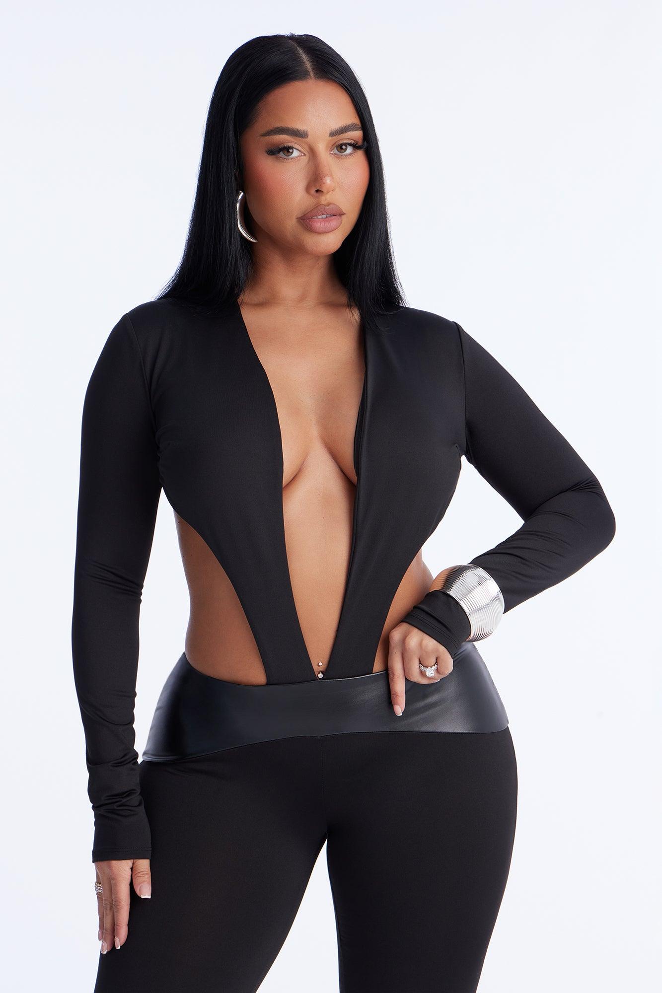 Available In Black. Jumpsuit Stretch Deep V-Neck Flare Leg Cut Out Detail Leather Trim Elastic Waistband 35" Inseam Self: 80% Polyester 20% Spandex Contrast: 95% Polyester 5% Spandex Imported