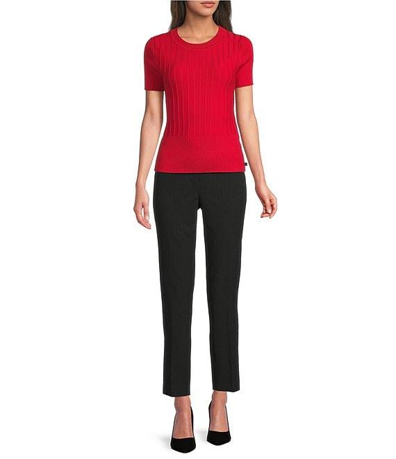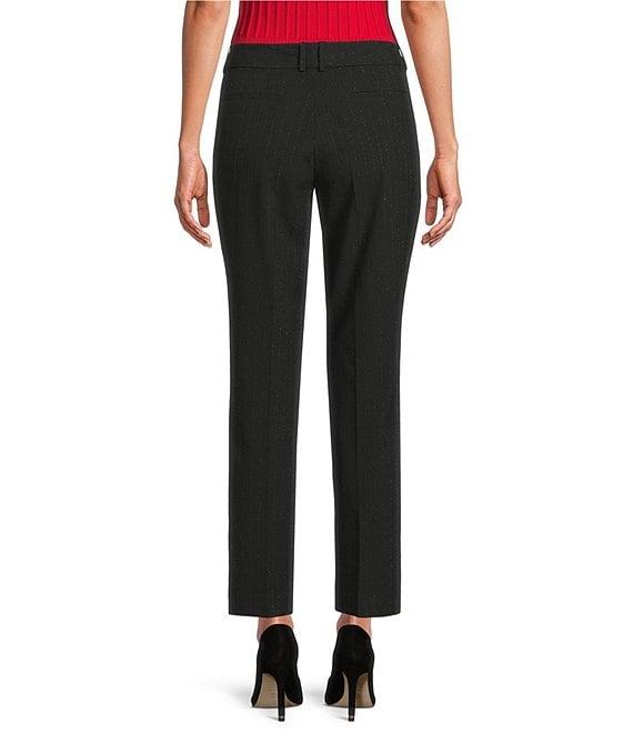 From KARL LAGERFELD PARIS, these pants feature: Metallic with lurex fabrication Flat front silhouette Side functional pockets Ankle length Front invisible zipper & hook-and-eye closure Approx. 28.25"inseam Polyester/viscose/spandex/metallic Dry clean only Imported.