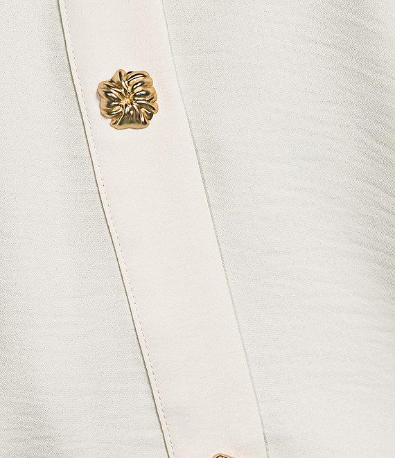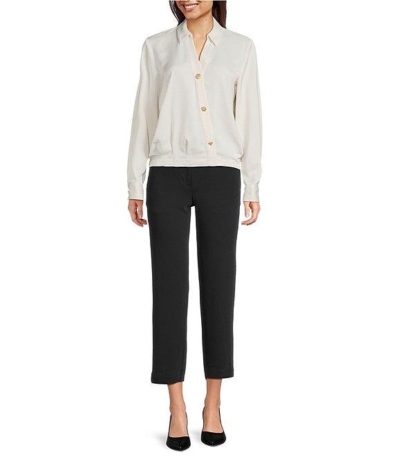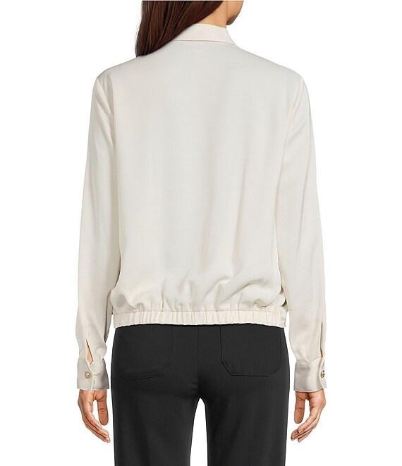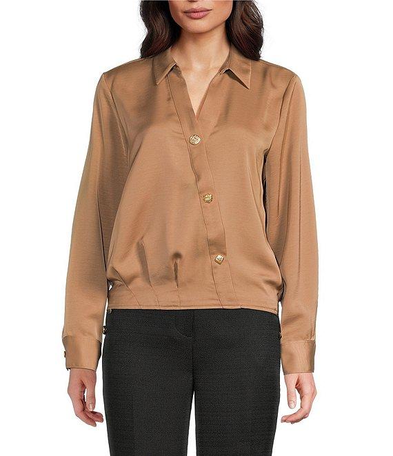 From KARL LAGERFELD PARIS, this blouse features: Satin fabrication Spread collar Long sleeves with cuffs Cropped length Front crossover detail Button front closure Approx. 22.5" body length, 32" sleeve length Polyester Machine wash cold/line dry Imported.