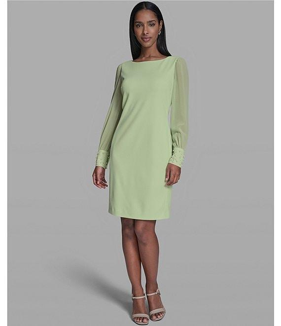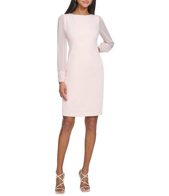 KARL LAGERFELD PARIS Scuba Crepe Crew Neck Chiffon Long Sleeve Pearl Cuff Sheath Mini Dress