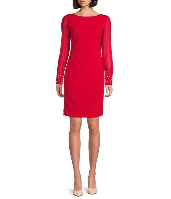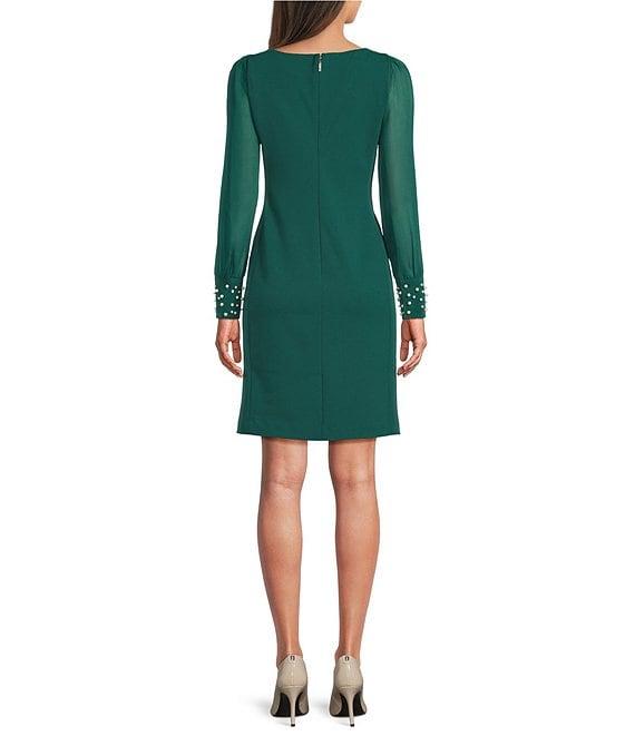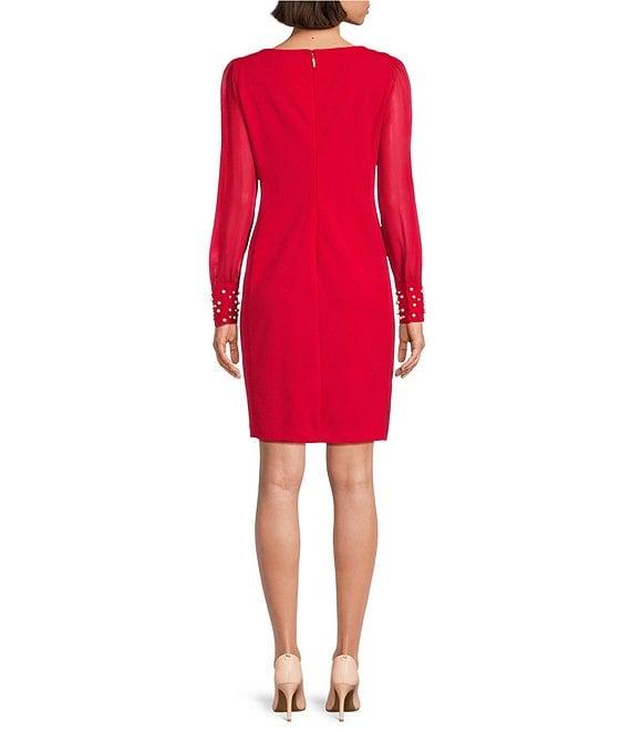 KARL LAGERFELD PARIS Scuba Crepe Crew Neck Chiffon Long Sleeve Pearl Cuff Sheath Mini Dress