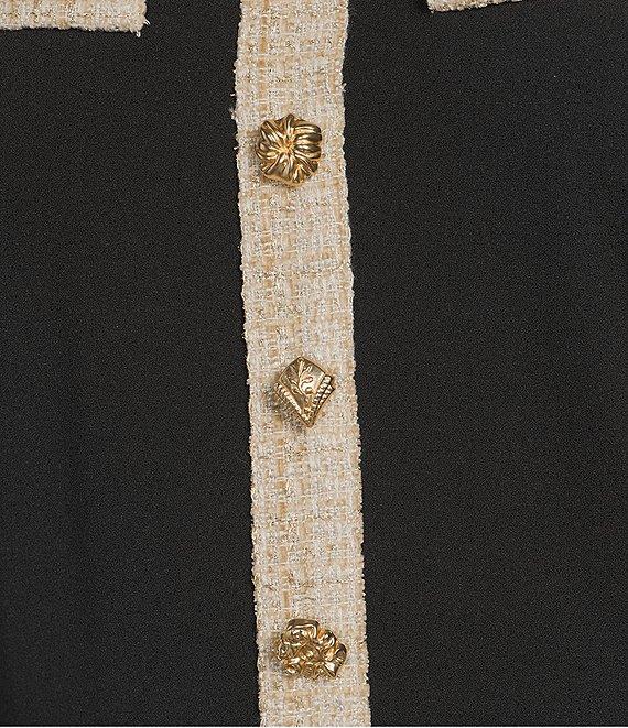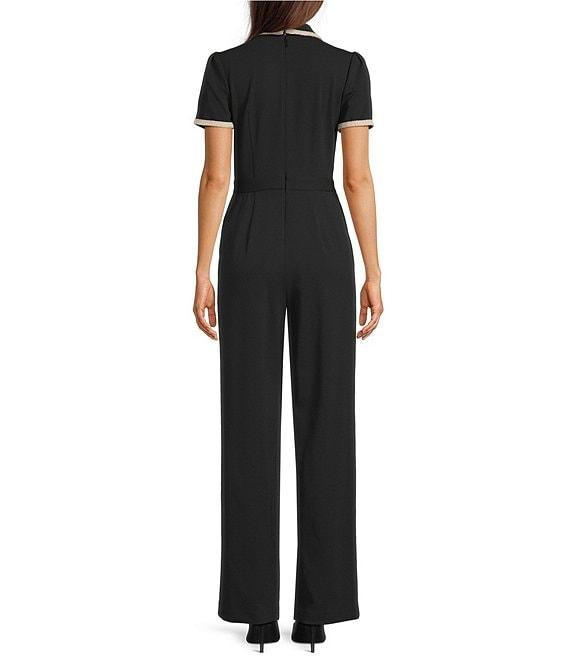 From KARL LAGERFELD PARIS, this dress features: Scuba crepe fabrication Tweed framing Collar neckline Short sleeves Wide leg silhouette Two pockets on front chest Functional pockets Button front detail Center back zipper closure Approx. 31.5" in length Polyester/spandex Dry clean only Imported.