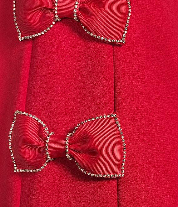 From KARL LAGERFELD PARIS, this dress features: Scuba crepe fabrication Round neckline Sleeveless Sheath silhouette Side seam rhinestone bow applique Center back zipper closure Approx. 35" in length Polyester/spandex Dry clean only Imported.