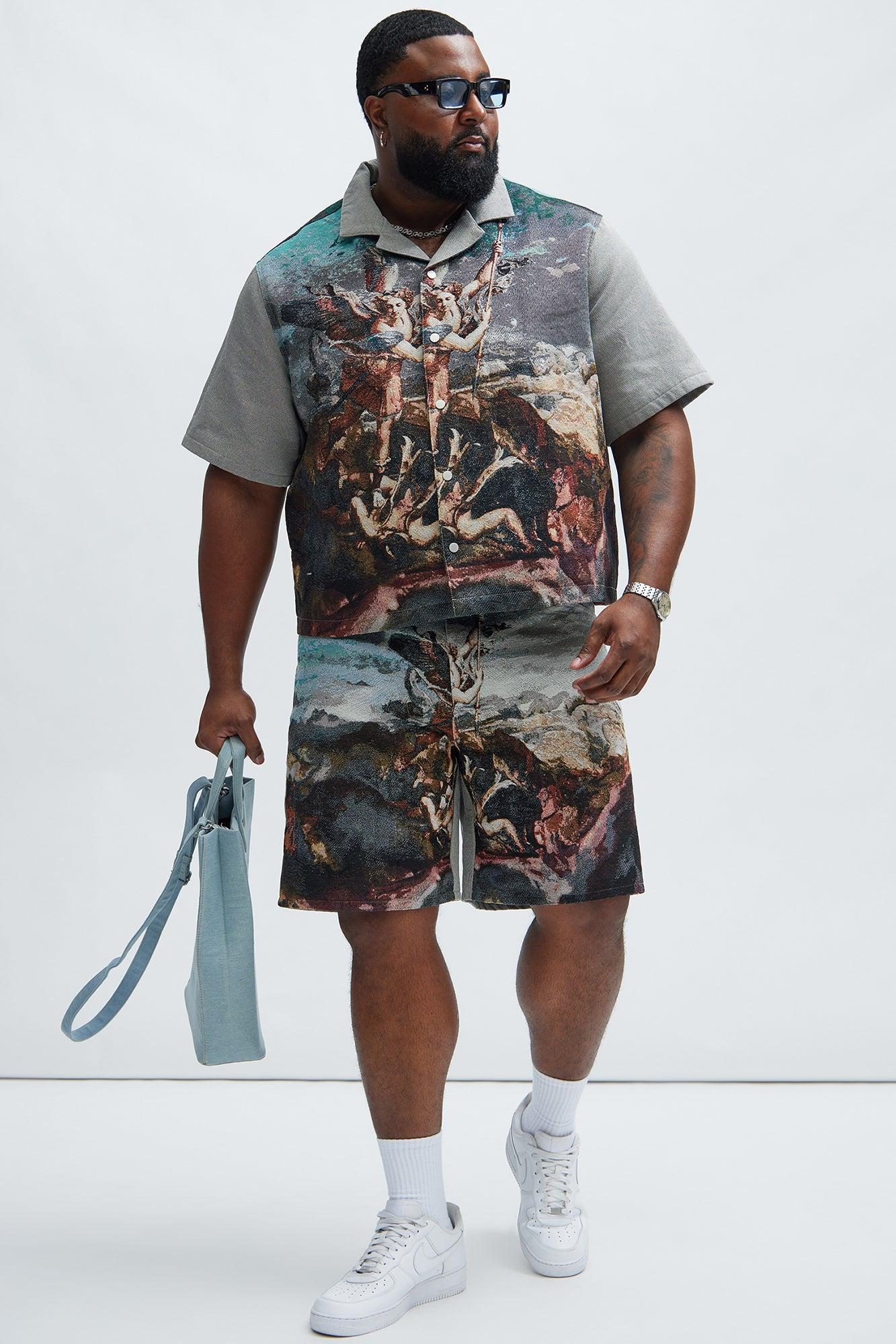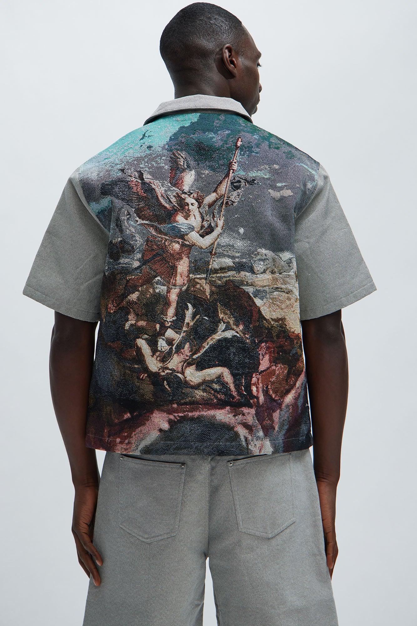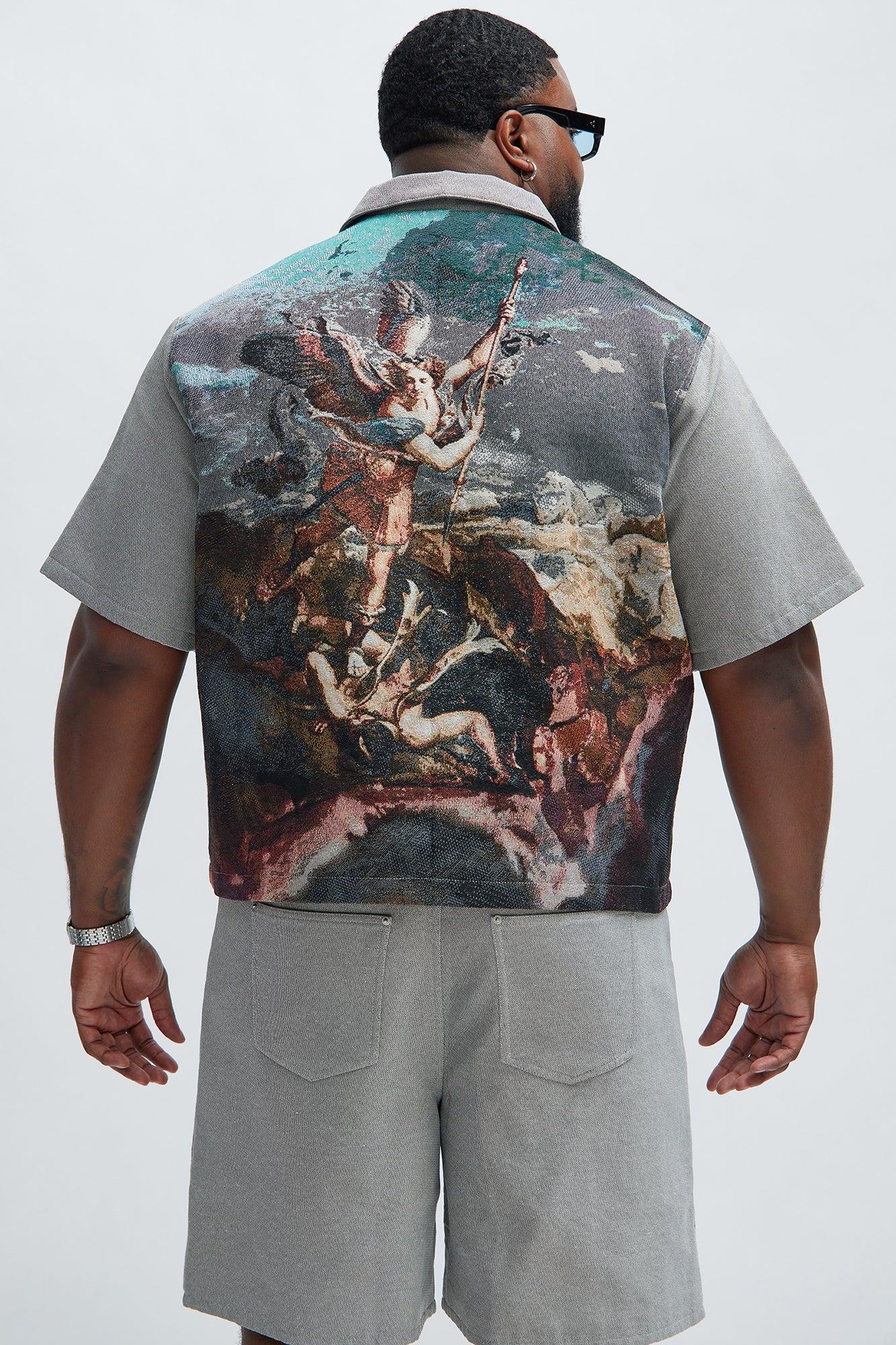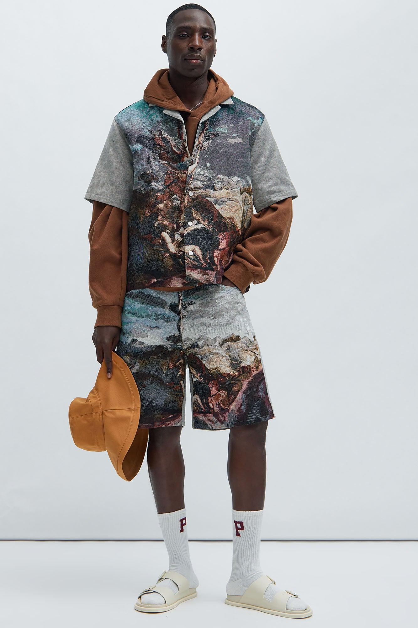 Available In Multi Color. Fold Down Collar Front Button Closure Short Sleeve Pair With "Karl Tapestry Shorts" Shell: 80% Polyester 20% Cotton Lining: 100% Polyester Imported California Proposition 65WARNING: Cancer and Reproductive Harm - www.P65Warnings.ca.gov.