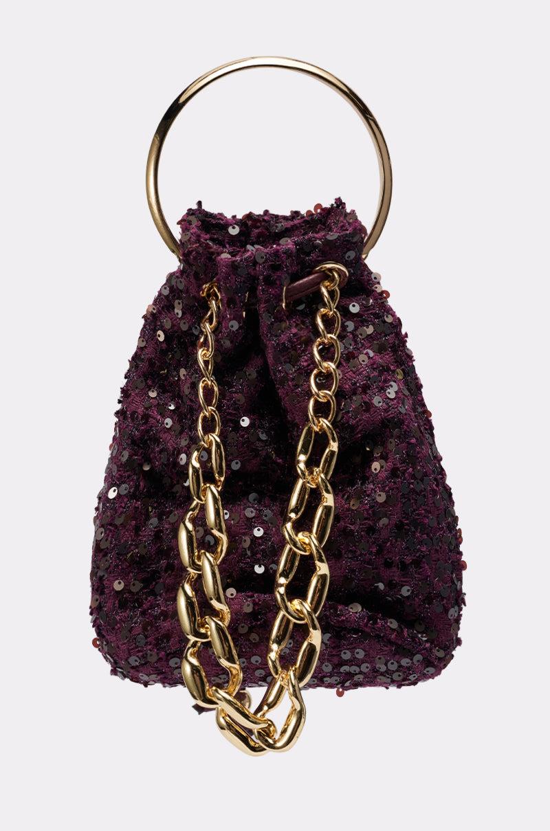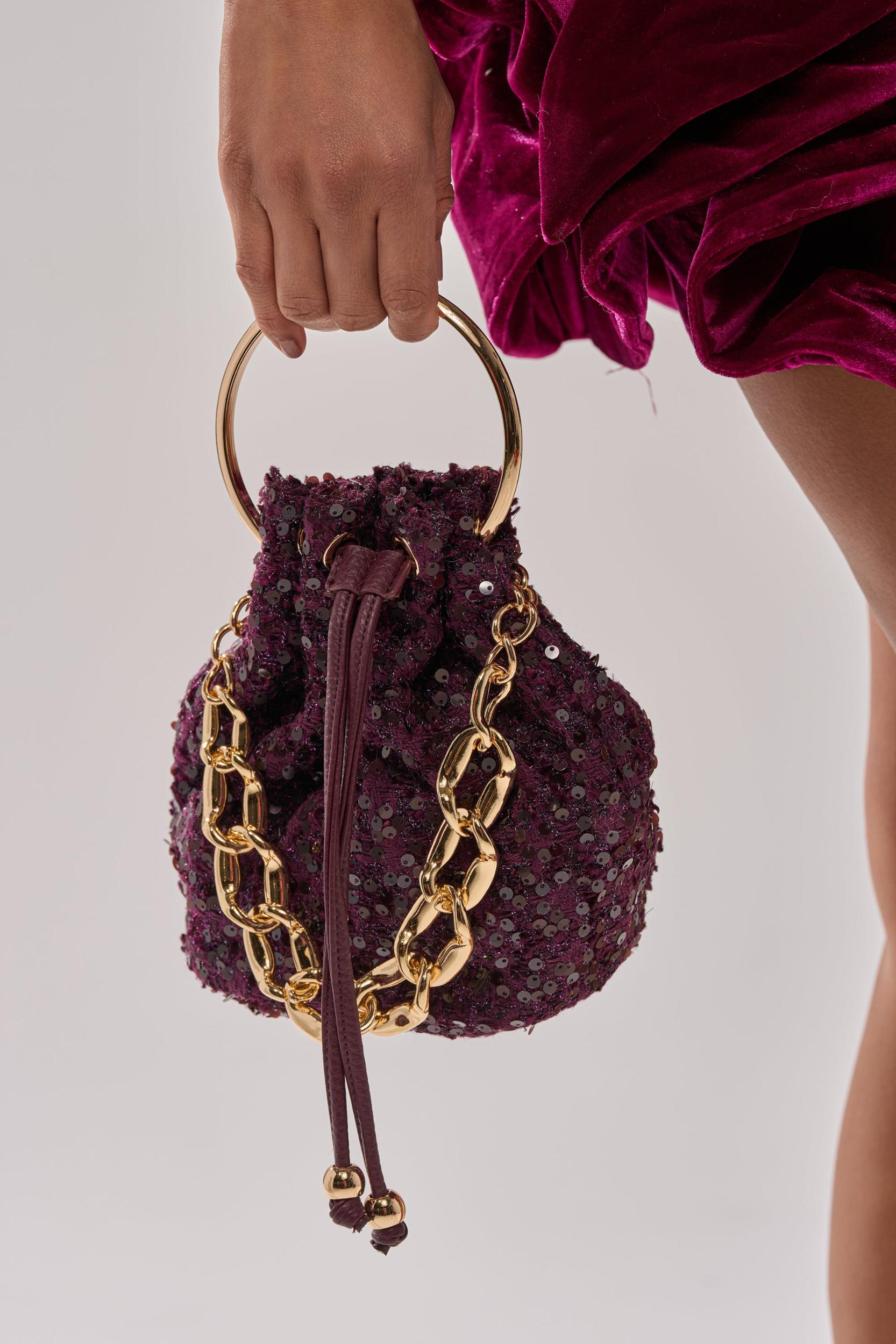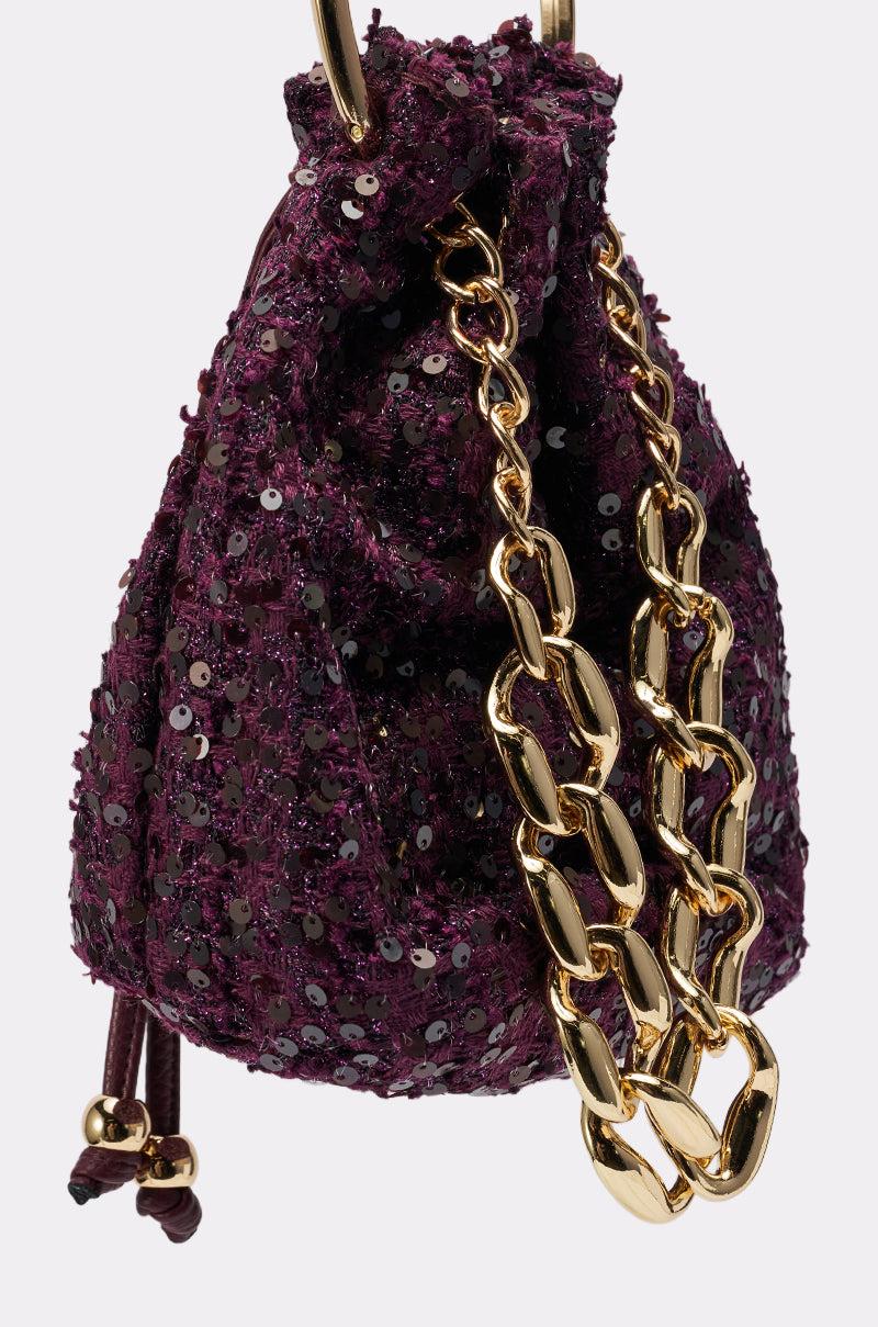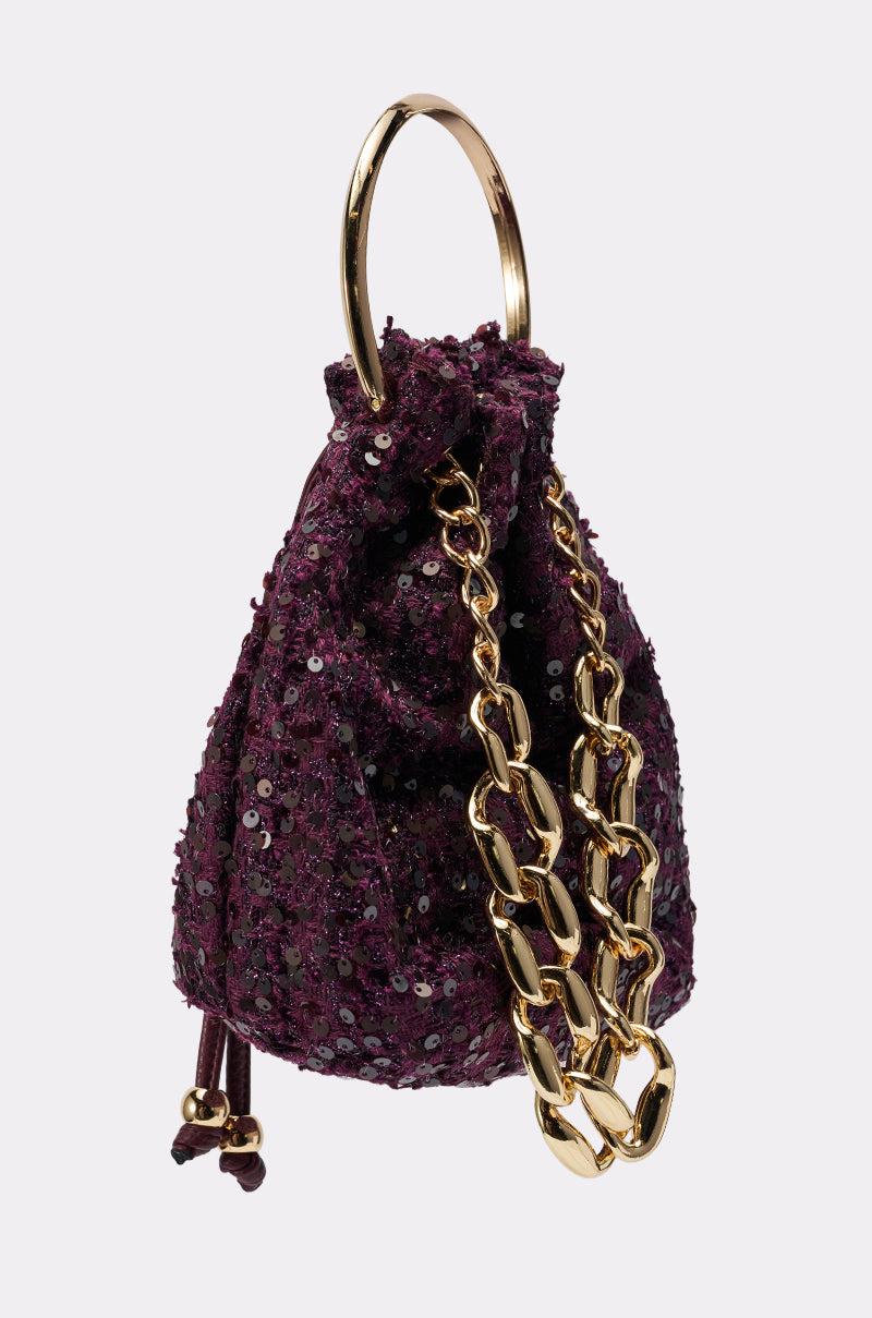 The AKIRA Label Kary Tweed Bucket Bag brings classic texture with a touch of modern glamour. Designed in a rich, woven tweed fabric, this mini bucket silhouette features a gold-tone top handle and an oversized chain accent for added luxury. The drawstring closure keeps your essentials secure while maintaining a soft, structured shape. Perfect for elevating both daytime looks and evening ensembles, this chic bag blends timeless sophistication with contemporary flair. - 65% Polyester, 20% Metal, 15% Plastic- Spot Clean Only- Imported (all measurements approximate from size O/S)- 19” Base Circumference- 8” Height- 10” Top HandleProduct ID: 1071111