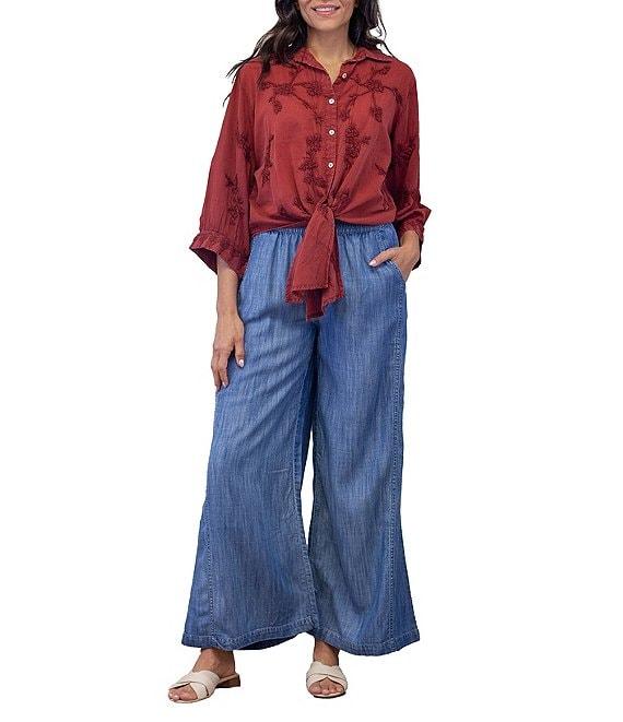 From Karyn Seo, this blouse features: Vintage-inspired tonal hand-embroidery Washed finish Point collar 3/4 wide sleeves with cuffs Tie front Back yoke Button-front closure Approx. 32" length Cotton Machine wash cold/ lay flat to dry Imported.