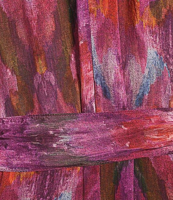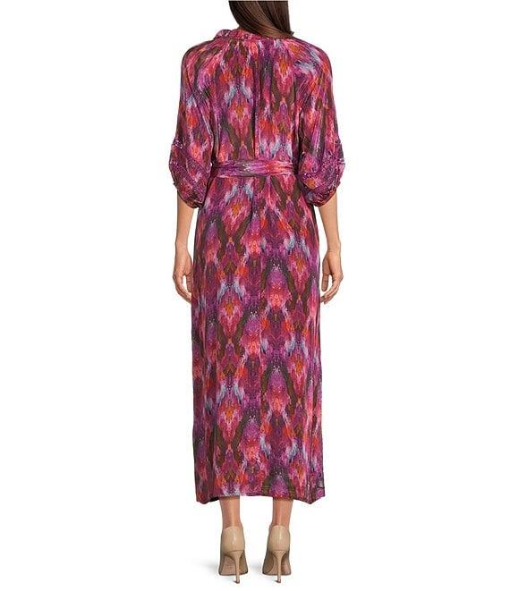 From Karyn Seo, this dress features: Woven fabrication A-line silhouette V-neckline 3/4 cinched sleeves with lace detail Abstract watercolor chevron print Removable belt at waist Side seam pockets Straight hemline Button front placket Approx. 51.5" length Cupra rayon Machine wash/flat dry Imported.