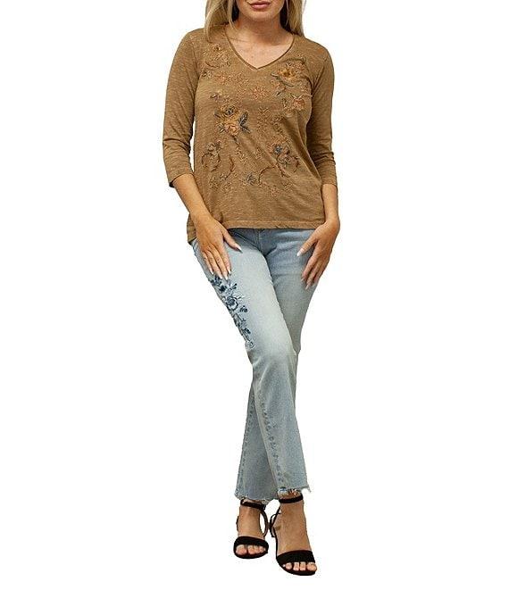 From Karyn Seo, this top features: Knit fabrication Tee silhouette Floral celestial motifs V-neckline 3/4 sleeves Multi-color embroidery Pullover construction Approx. 25.5" length Cotton Machine wash Imported.