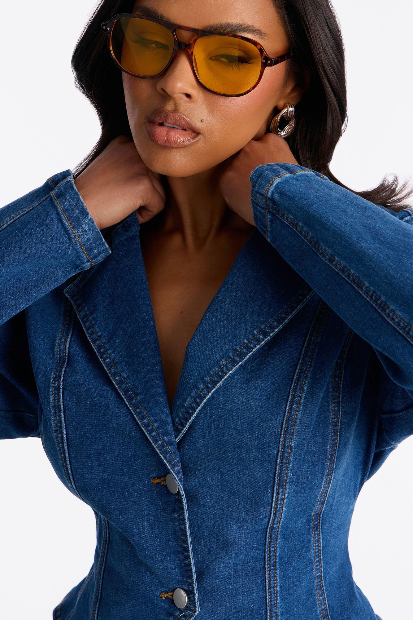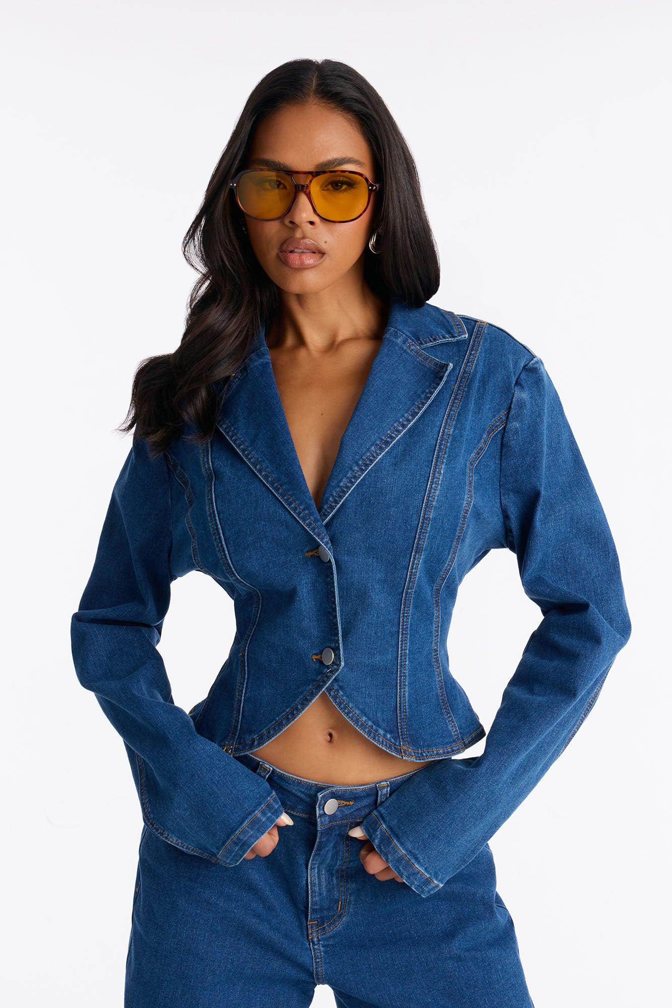 Available In Blue Wash. 2 Piece Ensemble Blazer And Pant Set Stretch Long Sleeve Back Tie Belt 5 Pocket Detail Front Zipper And Button Closure Wide Leg 34" Inseam Disclaimer: Due To The Specialized Wash & Distressing Process, Each Garment Is Unique. Shell: 80% Cotton 18% Polyester 2% Spandex Imported