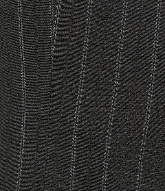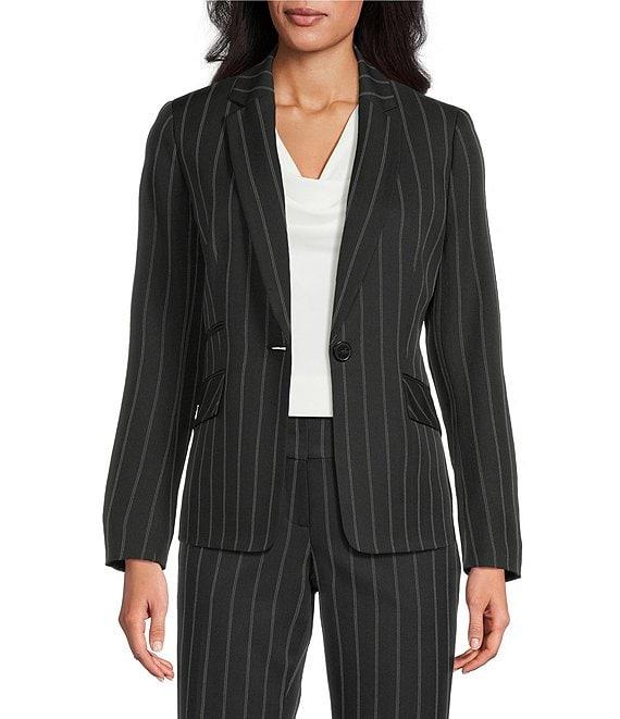 From Kasper, this jacket features: Pinstripe fabrication Blazer silhouette Notch collar neckline Long sleeves Two besom pockets Slim fit Fully lined Straight hemline Button front closure Approx. 25" length Polyester/viscose; lining: polyester Dry clean Imported.