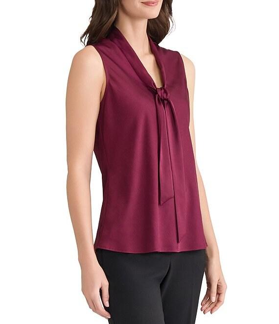 From Kasper, this blouse features: Textured satin fabrication Tie V-neckline Pull over construction Sleeveless Approx. 24" length Polyester Machine wash Imported.