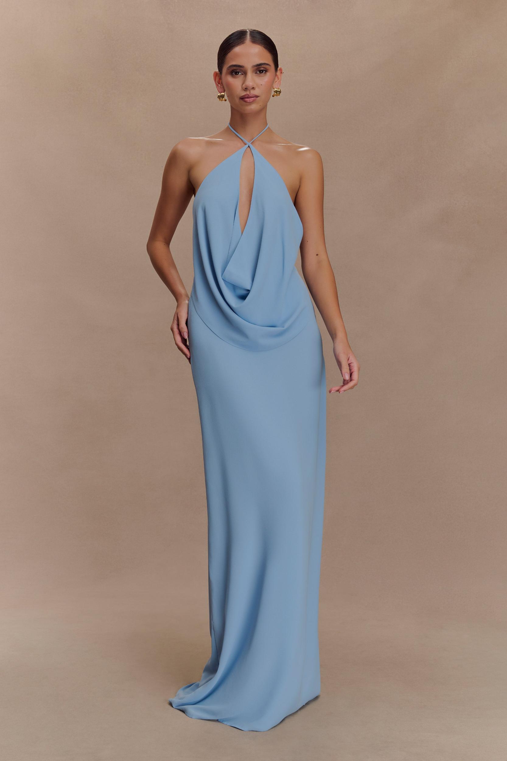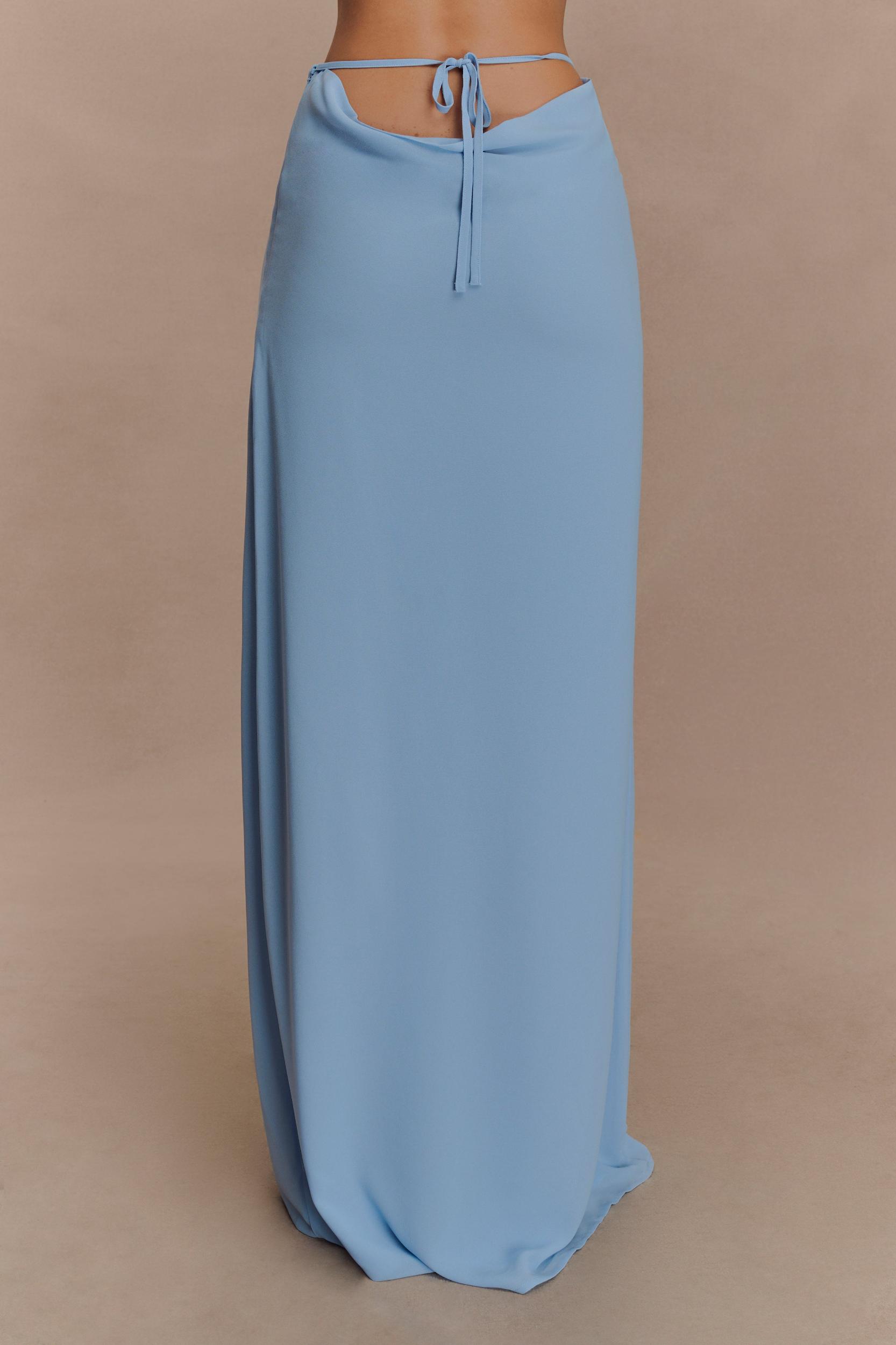 The skirt that catches every breeze. The KATALINA Chiffon Maxi Skirt is a refined silhouette crafted for graceful movement and understated impact. Designed with a high waisted fit and a sleek column shape, it features a tie-back waistband and invisible side zip for a smooth, adjustable fit. A softly draped cowl seam at the back waist adds a delicate touch of texture. Pair it with the Katalina Chiffon Cowl Halter Top for a coordinated look that’s light, fluid, and perfect for sun-drenched events or elegant evening escapes.