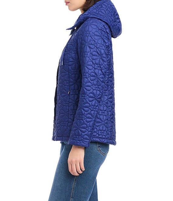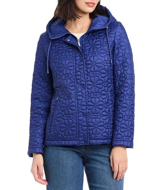 From kate spade new york, this jacket features: Quilt fabrication Field jacket silhouette Floral pattern Stand collar neckline Attached hood Long sleeves Front seam pockets with invisible zip closure Tailored fit Fully lined Straight hemline Snap front/zip closure Approx. 25.5" length Nylon; lining: polyester Machine wash Imported.