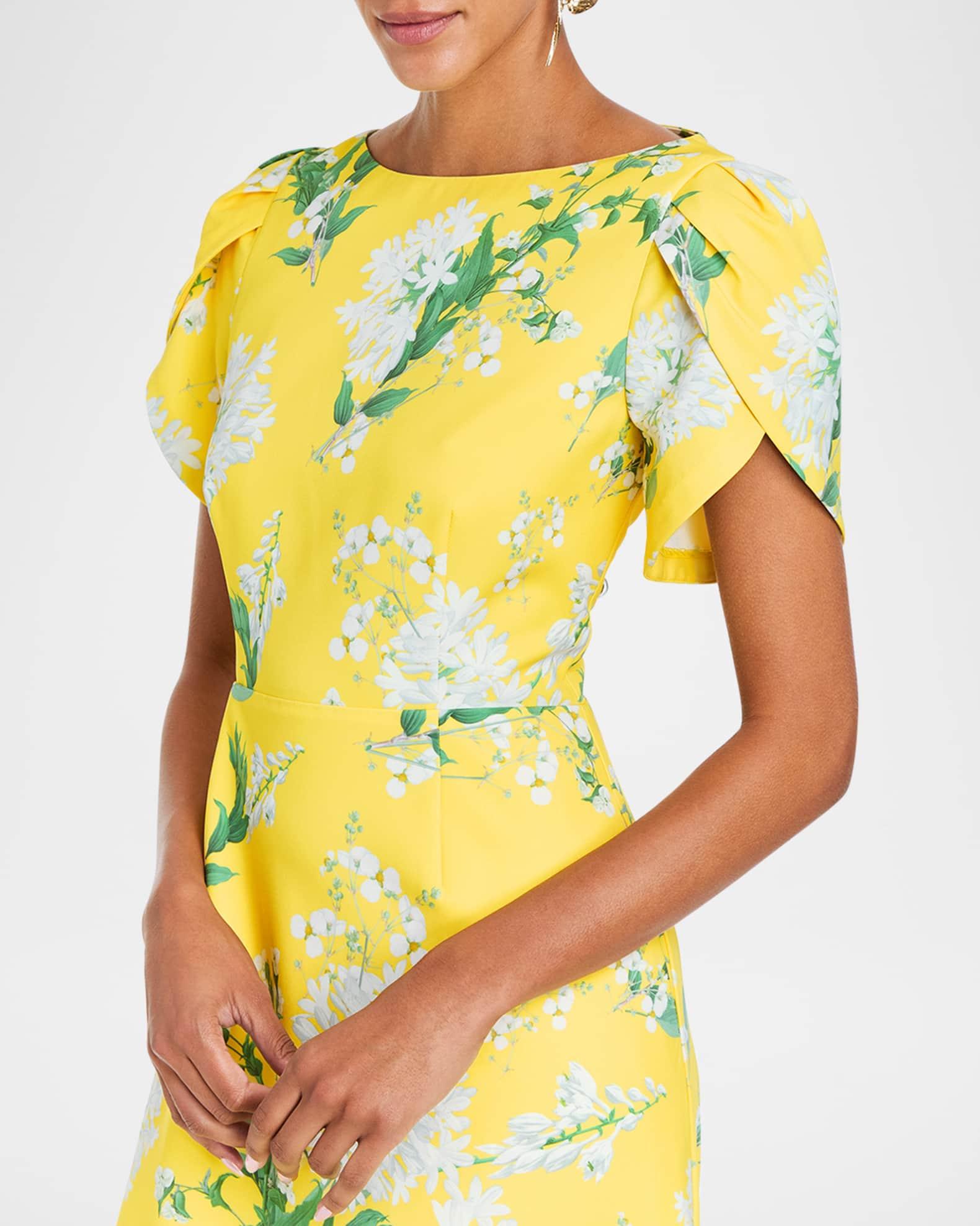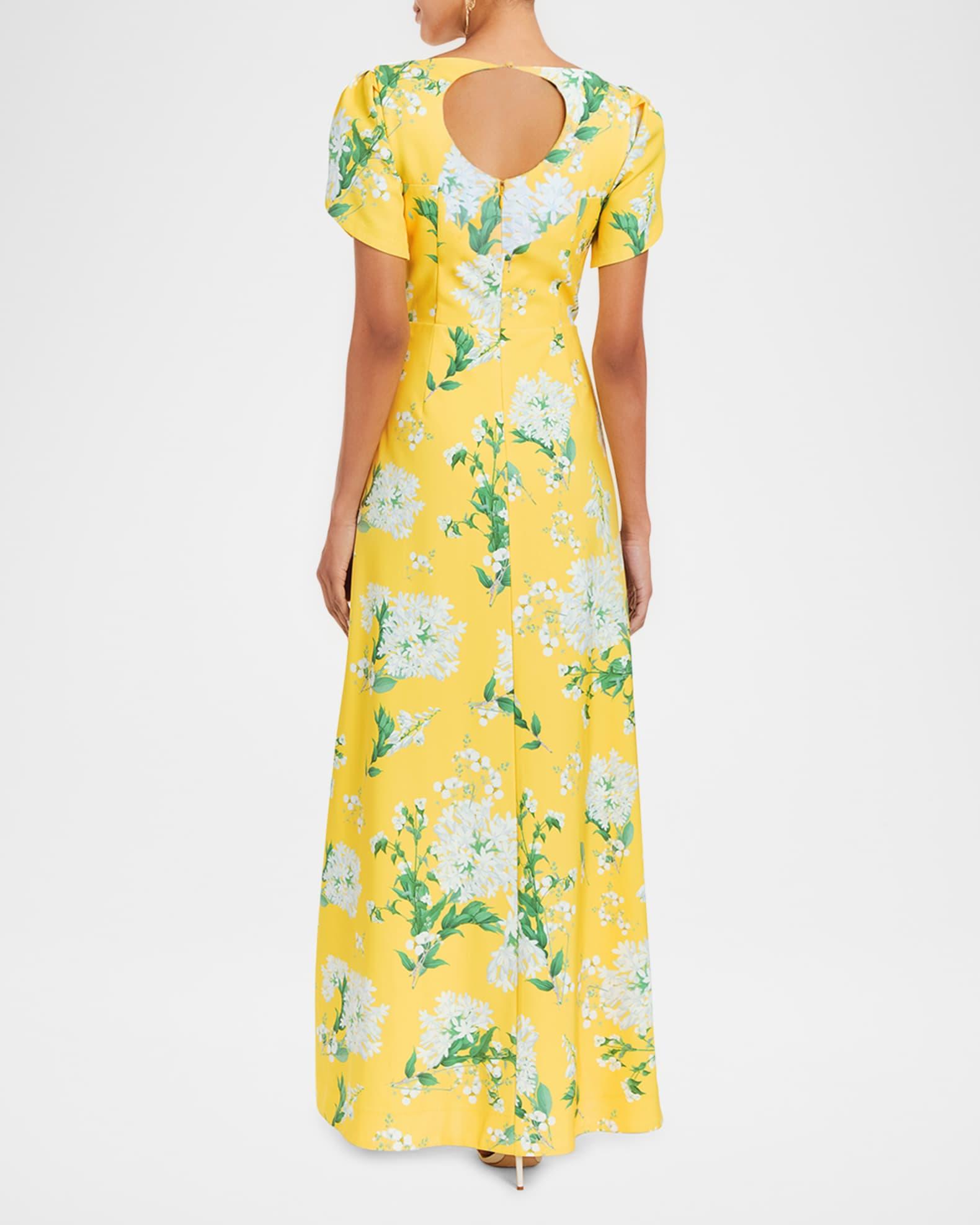 Mestiza New York "Katherine" floral-print gown with pleated detailing Approx. 61"L from shoulders to hem High neckline Short tulip sleeves Upper back cutout Full length A-line silhouette Button back Invisible back zipper Polyester Dry clean Imported