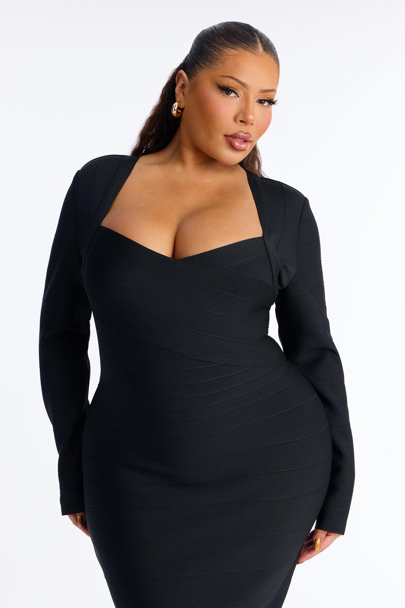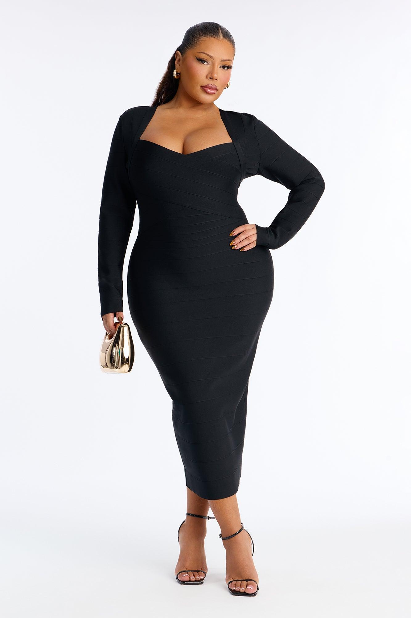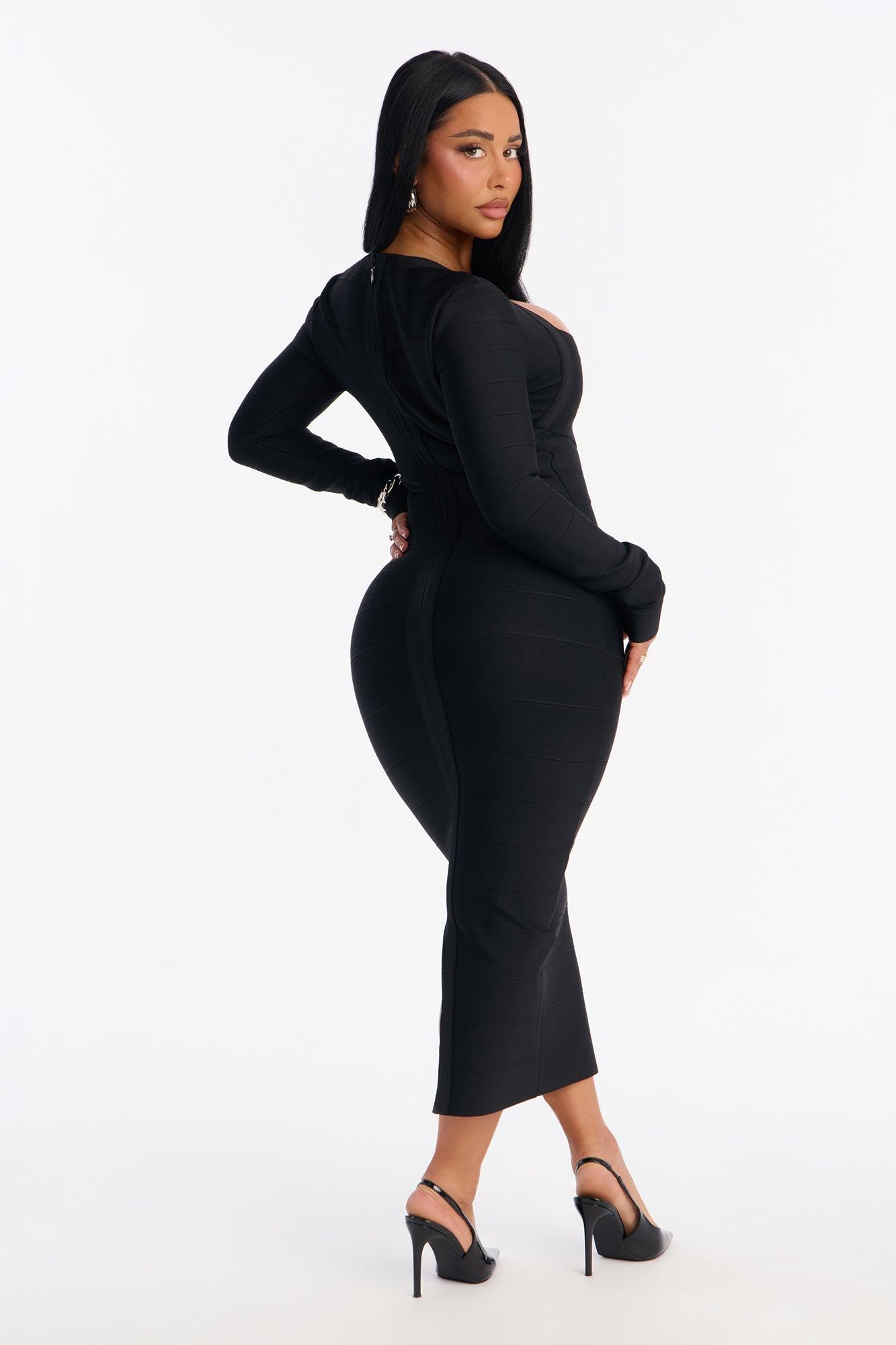Available In Black And Pink. Bandage Midi Dress V-Neckline Long Sleeve Slit Zipper Stretch Length Measured Flat = 47" Self: 90% Polyester 10% Spandex Imported