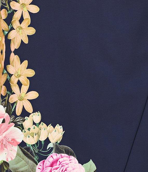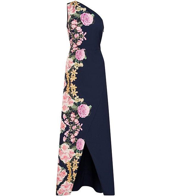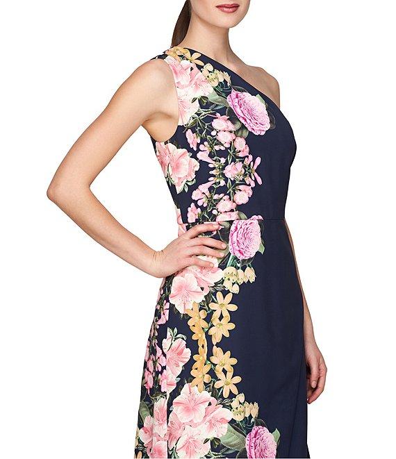 Kay Unger Stretch Crepe Floral Border Print One Shoulder Sleeveless Gown