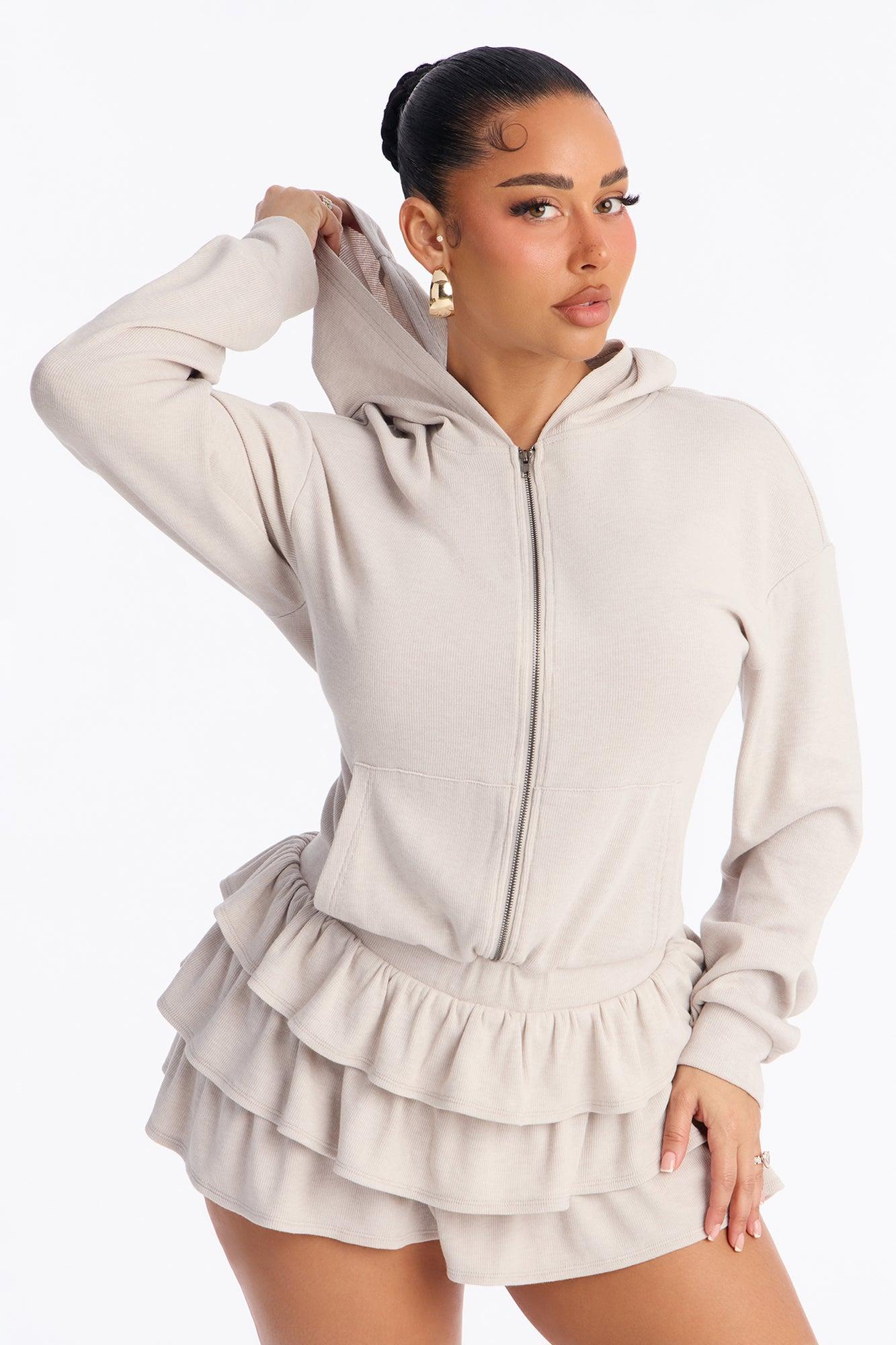 Available In Light Grey. Sweater Micro Mini Dress Hoodie Long Sleeve Pockets Ruffle Zip Up Front Under Shorts Lining Stretch Length Measured Flat = 29" Self: 67% Polyester 28% Rayon 5% Spandex Imported California Proposition 65WARNING: Cancer and Reproductive Harm - www.P65Warnings.ca.gov.