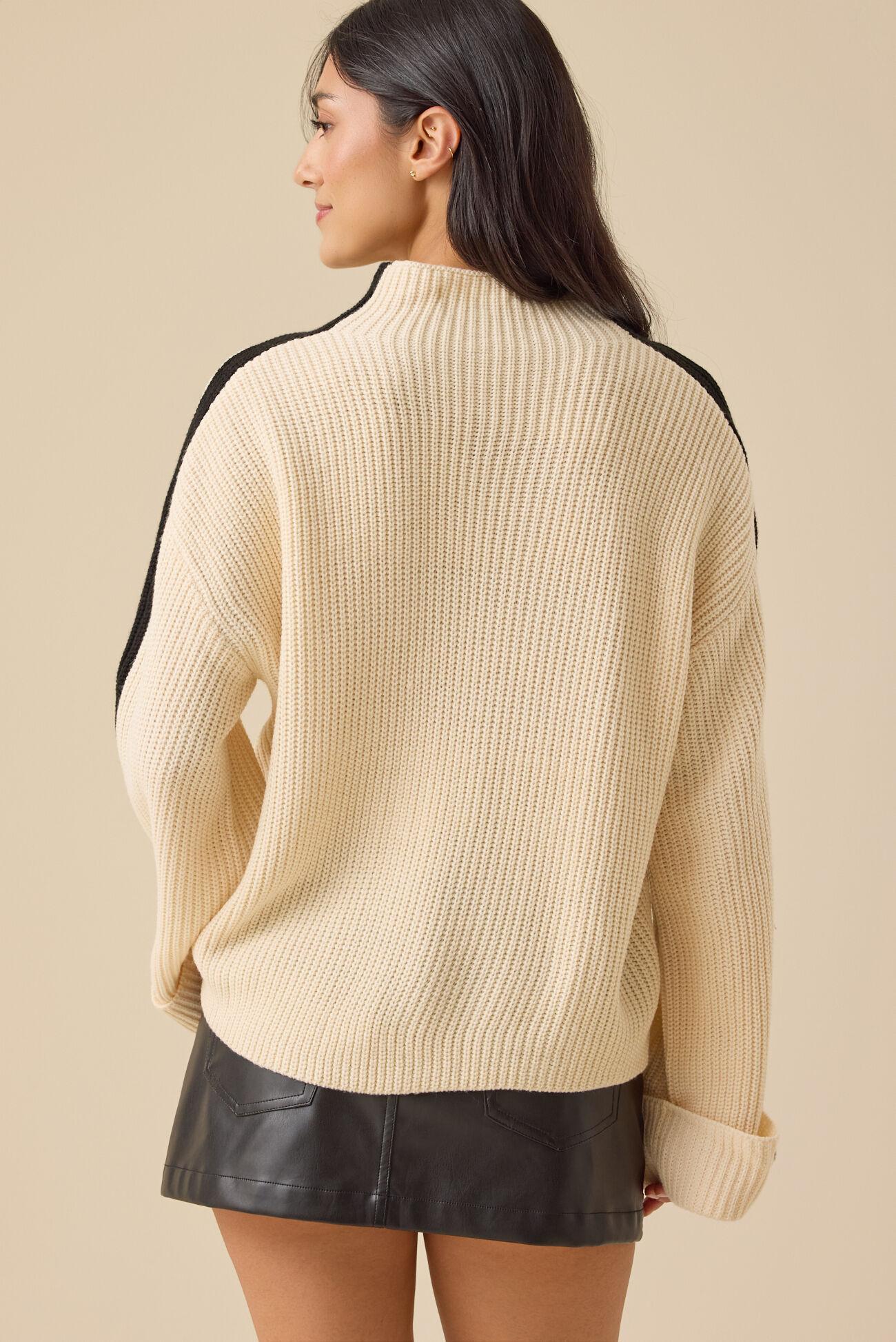 This stylish mock neck sweater offers a chic, modern look. It features a bold stripe down the side, blending sophisticated warmth with contemporary flair.