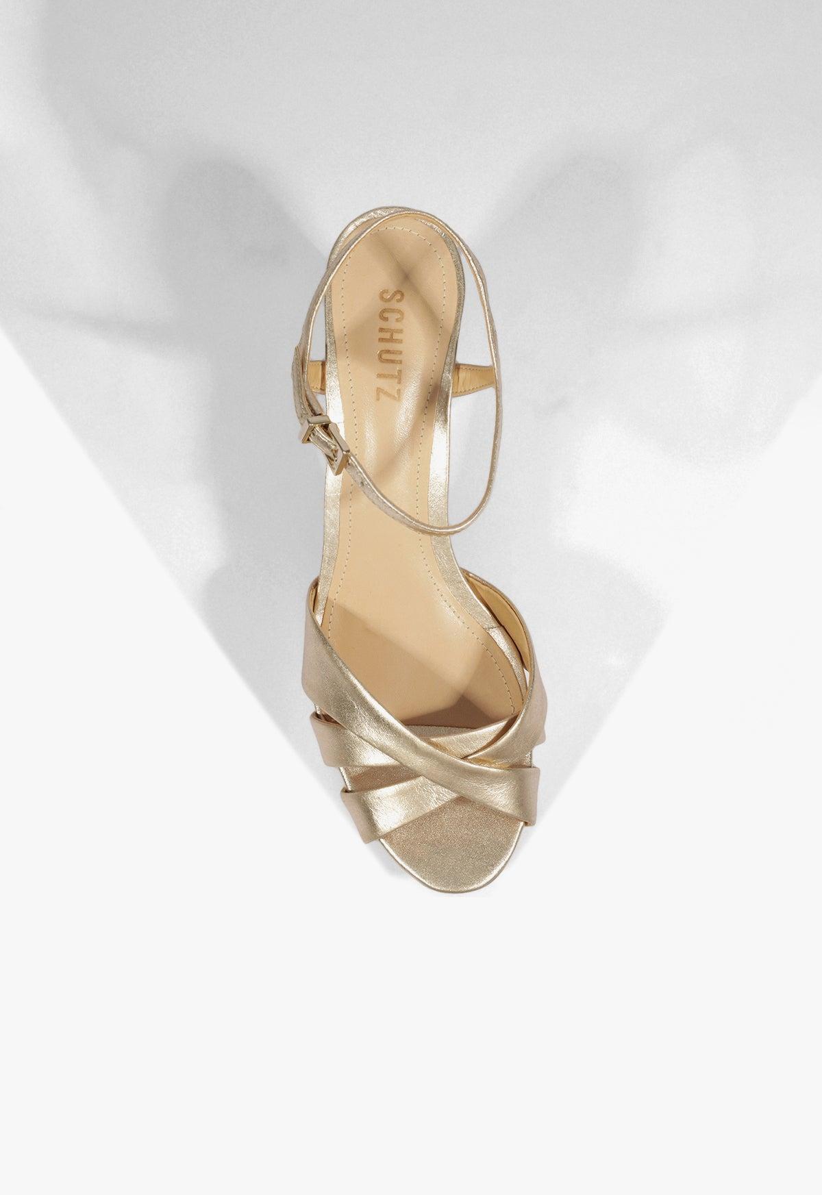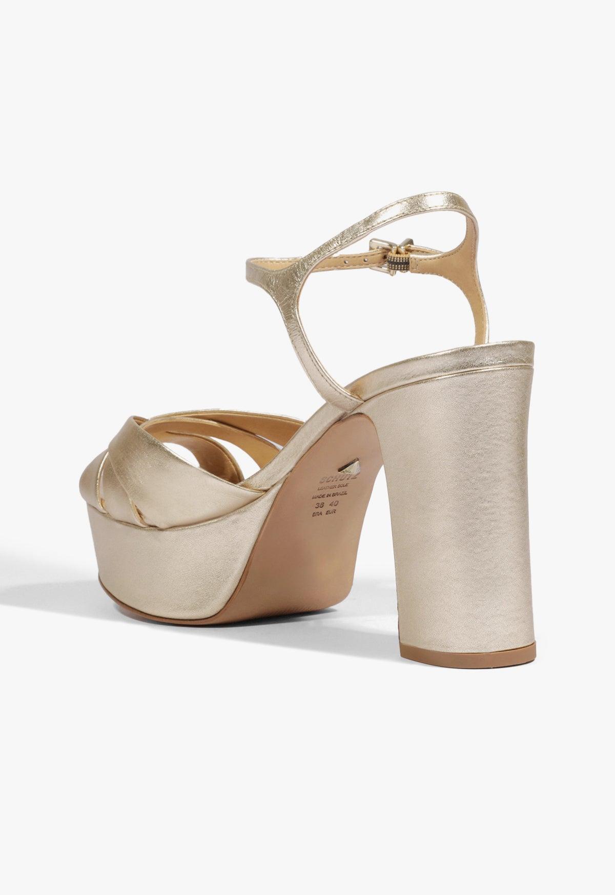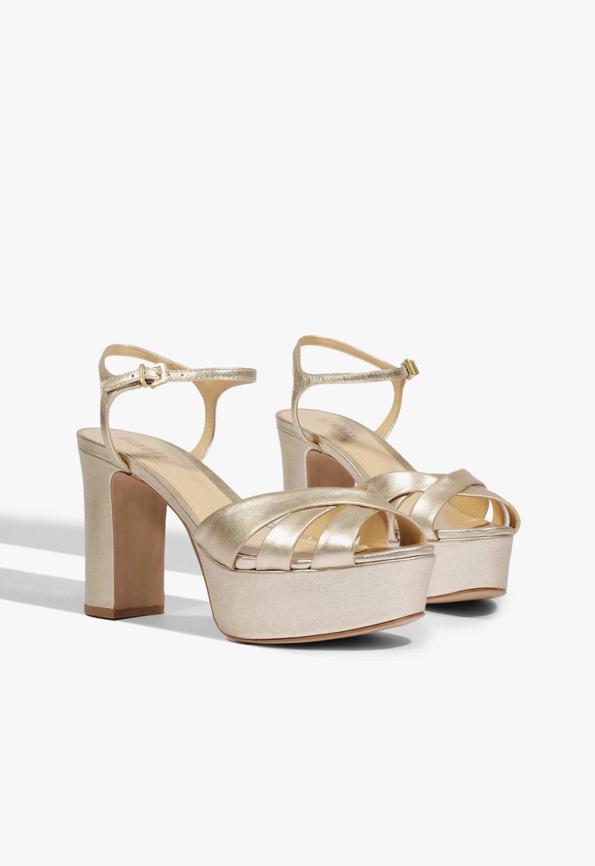 Experience mesmerizing disco glamour with the Keefa Sandal. Step out in style with the striking chunky high-heeled platform silhouette, enhanced by luxurious soft leather. Elevate your fashion with the elegant crisscross toe band, making this day-to-night sandal the epitome of chic sophistication. Materials: Metallic Leather | Cow leather lining | Cow leather outsole Rubber patch at the heel. Heel Type: High Heel Heel Style: Block Toe Style: Round toe Closure Style: Buckled Strap Platform Height: 40mm Heel Height: 4.1in | 105mm SKU: S2034600030038