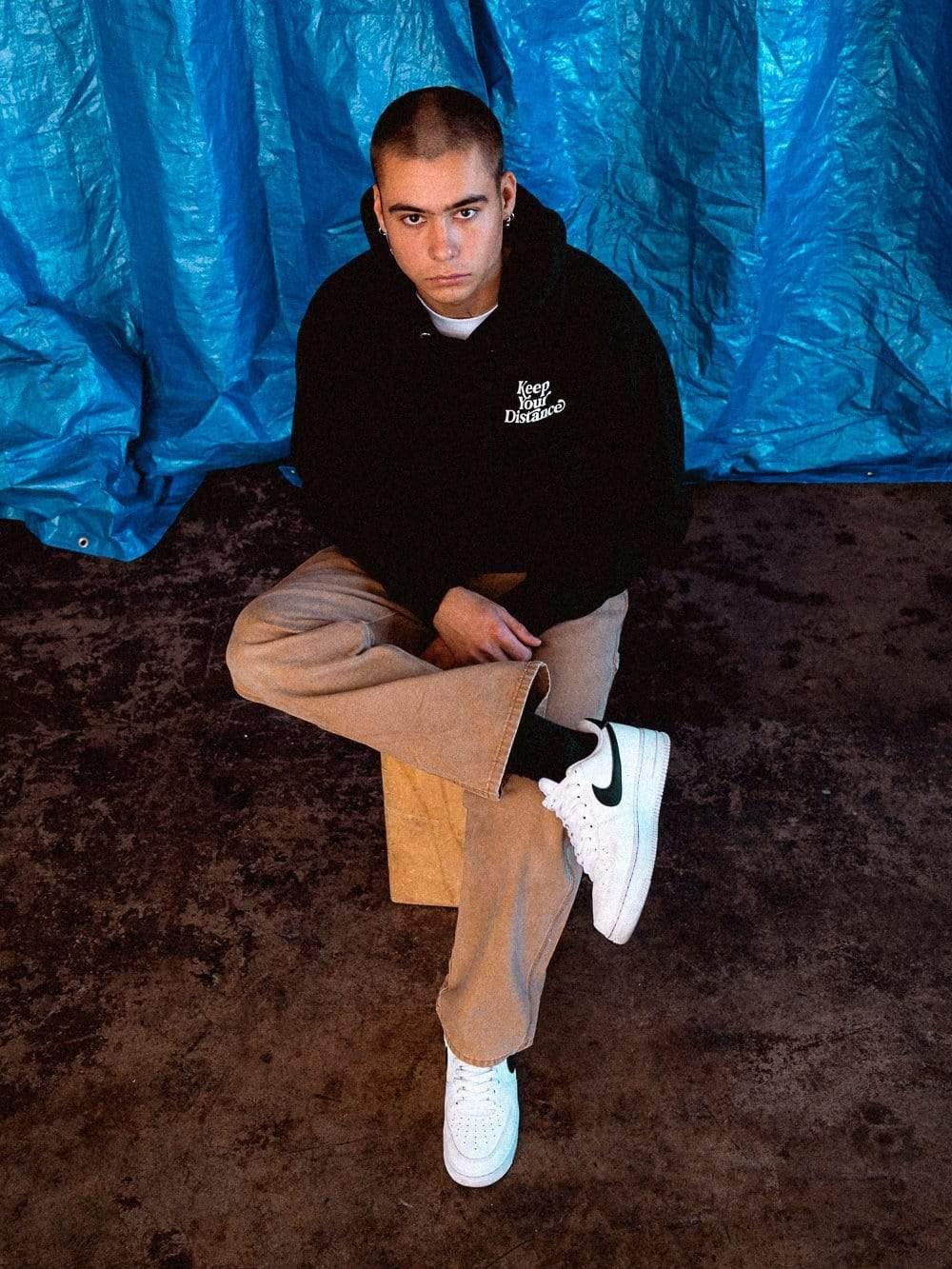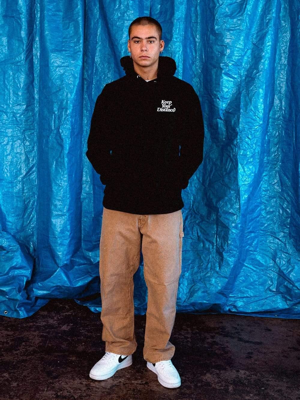 Friendly reminder to please keep your distance. Black vintage hoodie is designed with 3D puff print text on the front and back. Rib-knit banding at the cuffs and hem provides a snug and secure fit. Hoodie is also laced with an adjustable hood and a large front pocket. ESTIMATED TO SHIP 3-4 WEEKS FROM ORDER DATE. True to size. Cam is 6'2”, and is wearing size large 50% Cotton, 50% Polyester Machine wash cold with like colors. Hang to dry. Order one size up for oversized fit*