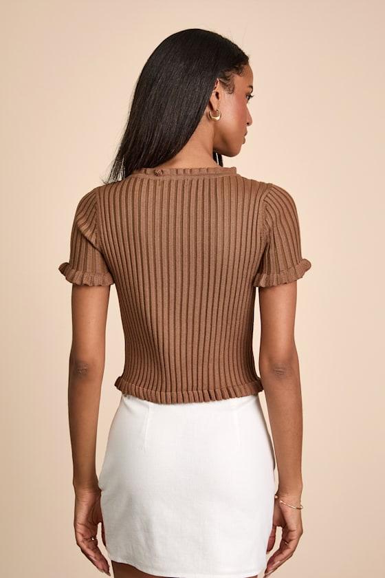 With a comfy ribbed sweater knit and an effortless, feminine aesthetic, you'll constantly reach for this versatile top to create endlessly cute OOTDs. Pair the flattering V-neckline with your favorite layered jewelry, accentuating the fitted, button-front bodice framed by classic short sleeves. Flirty ruffles trim the neckline, cuffs, and slightly cropped hem.