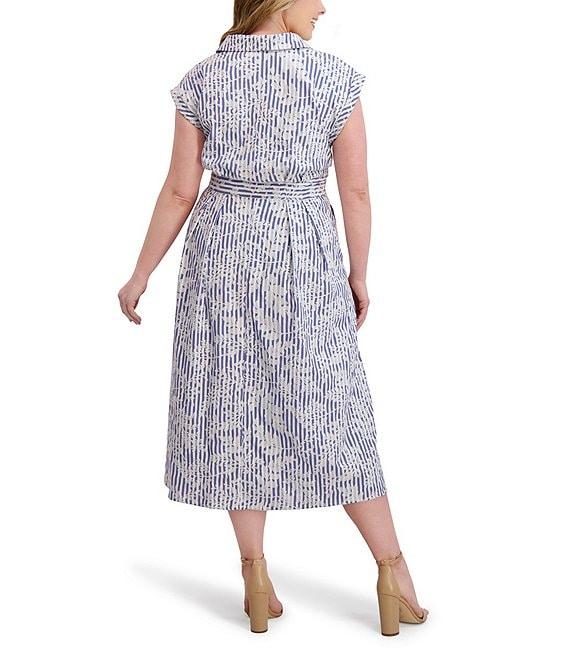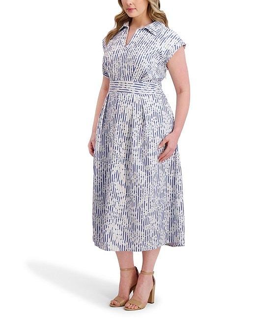 From Kensie Plus, this dress features: Embroidered woven fabrication V-neckline with a collar Short sleeves Shirt silhouette Lined Pockets Stripe print Zip closure Approx. 51.5" in center back length Polyester/spandex Machine wash/dry flat Imported.