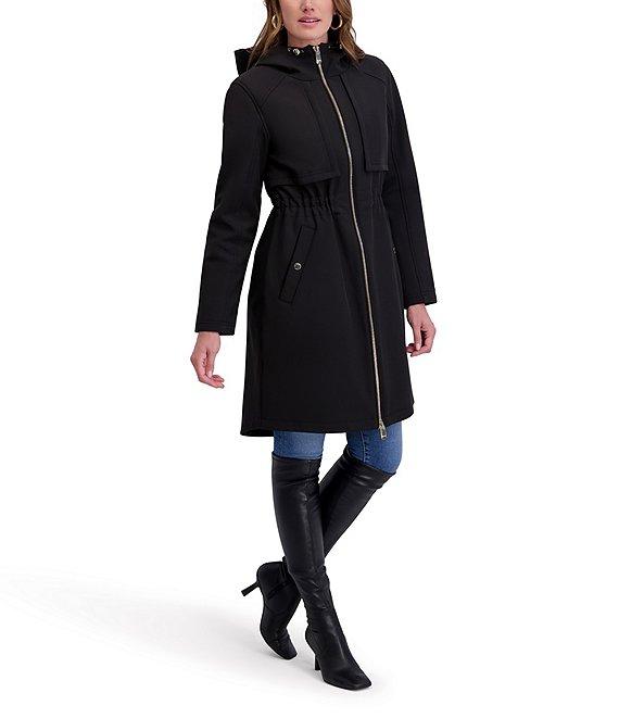 From Kensie, this coat features: Softshell fabrication Walker silhouette Funnel neckline Attached hooded Long sleeves Two angled snap pockets Flange front detail Drawcord waistline Water resistance Loose fit Unlined Shirttail hemline Zip front closure Polyester/spandex/shell back/polyester Machine wash Imported.