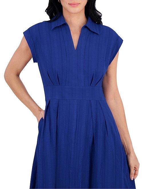 From Kensie, this dress features:Striped cotton fabrication point collar v-neckline Cap dolman sleevesSmocked PleatedLined Zip closure Approx. 49" length Cotton Hand wash Imported.