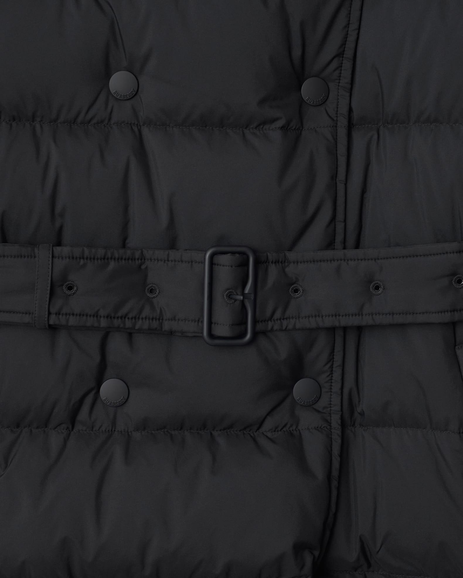 Burberry "Kent" parka jacket, inspired by the classic trench coat, features a detachable hood, shoulder epaulets, signature check lining, and a B-buckle belted waist Point collar; double-breasted snap front Long sleeves Hip snap welt pockets Straight fit Hem falls below the hip Nylon/polyamide/polyester Lining: Nylon Fill: Polyester, Down/Feather Imported Comes with a garment bag