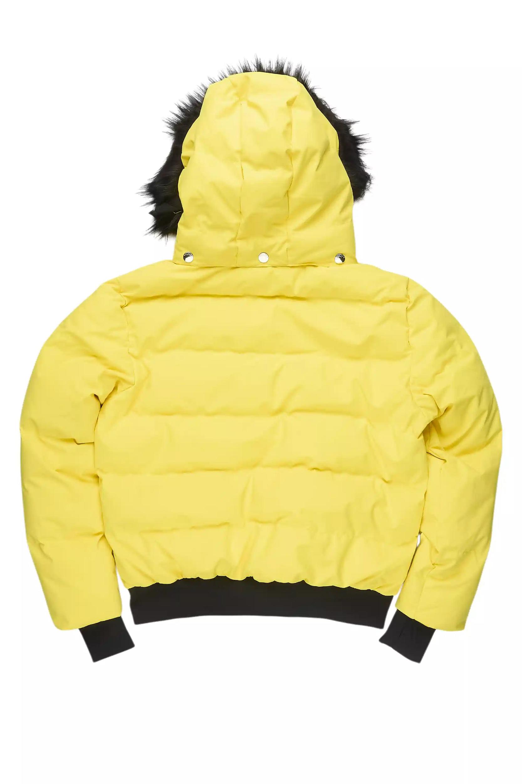 An urban quilted puffer jacket for women in yellow. Designed with water-resistant fabric and insulation for a versatile streetwear style. Removable button faux fur hood Full front zip closure Long sleeves Ribbed knit cuffs Dual slant pockets Printed RSO logo