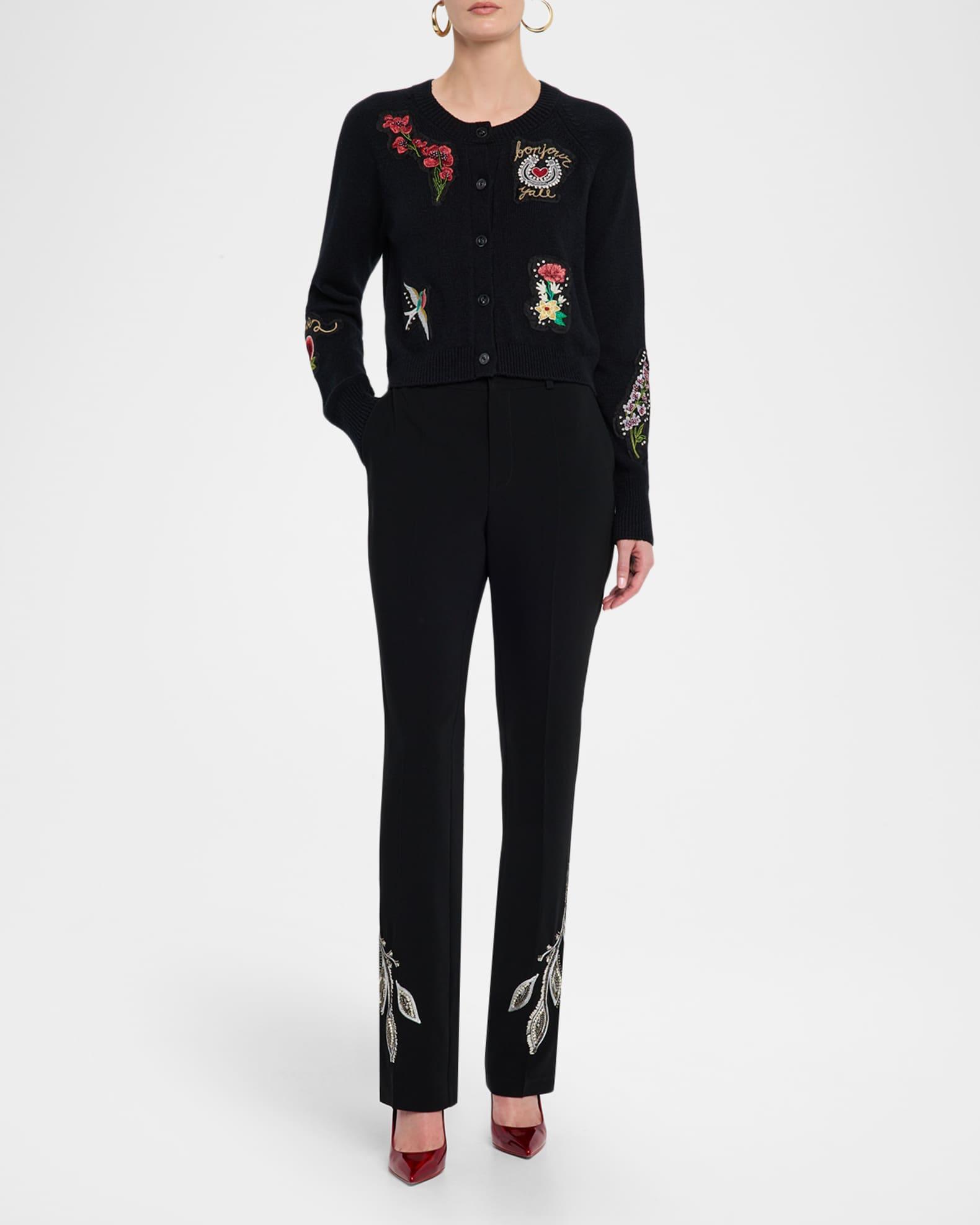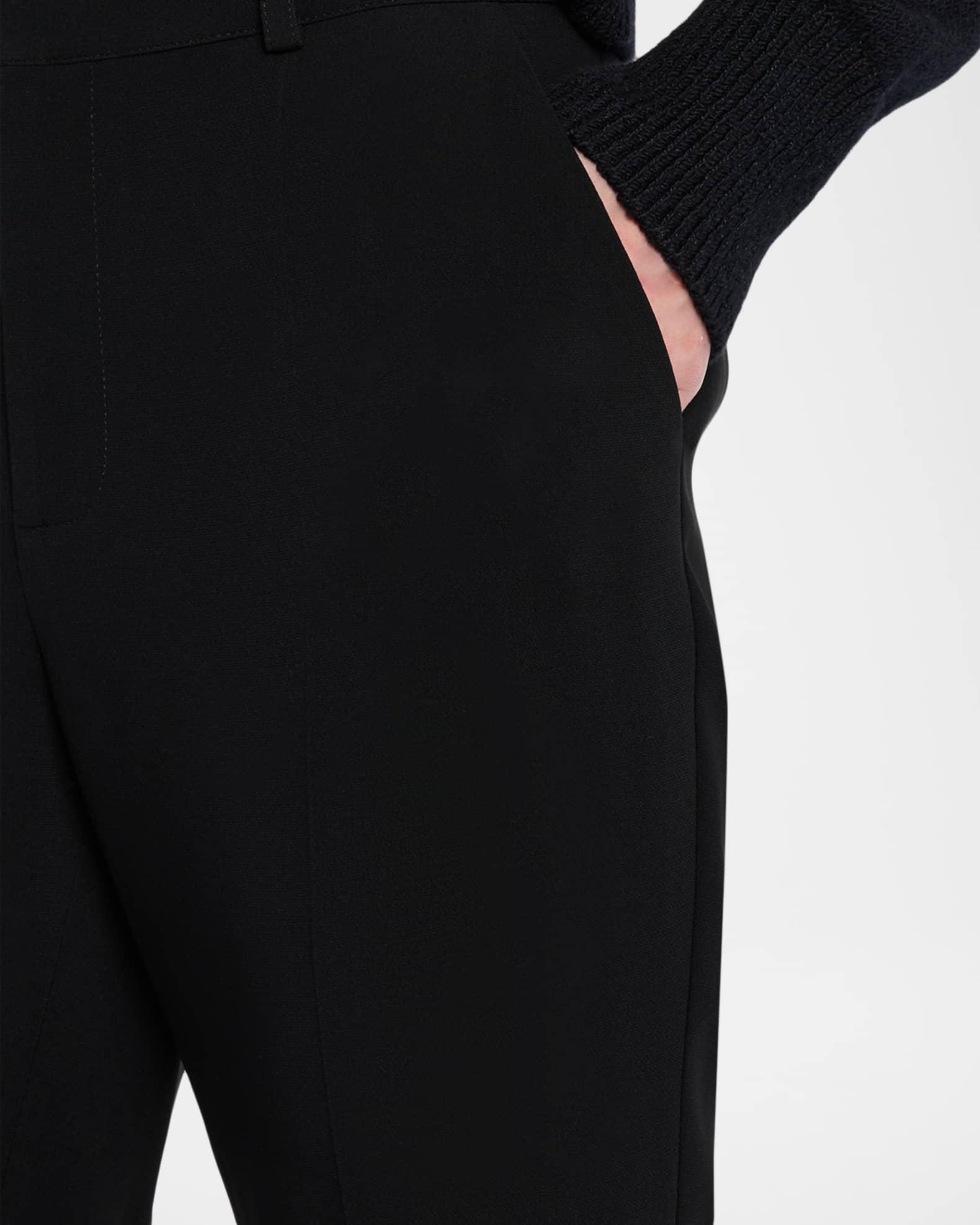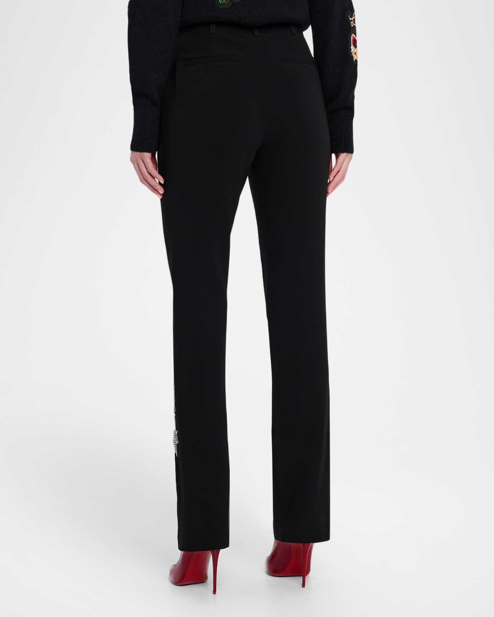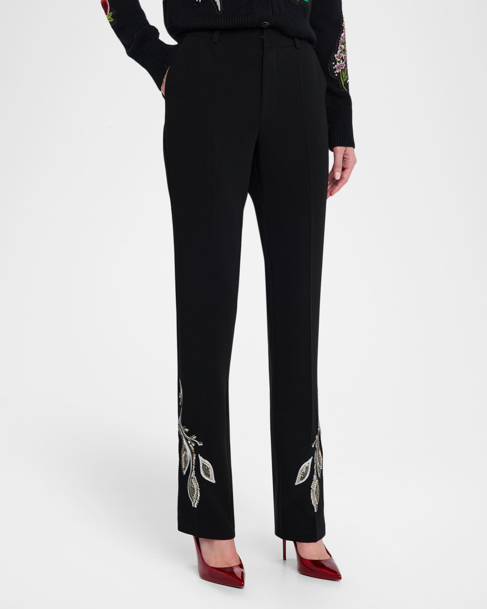 Cinq a Sept "Kerry" crepe pants embellished with a beaded paisley detail at the hem for a touch of glamour Approx. 10.5" rise; 34" inseam High rise Four-pocket style Straight legs Full length Hook/zip fly; belt loops Triacetate/polyester Lining: Polyester Dry clean Imported