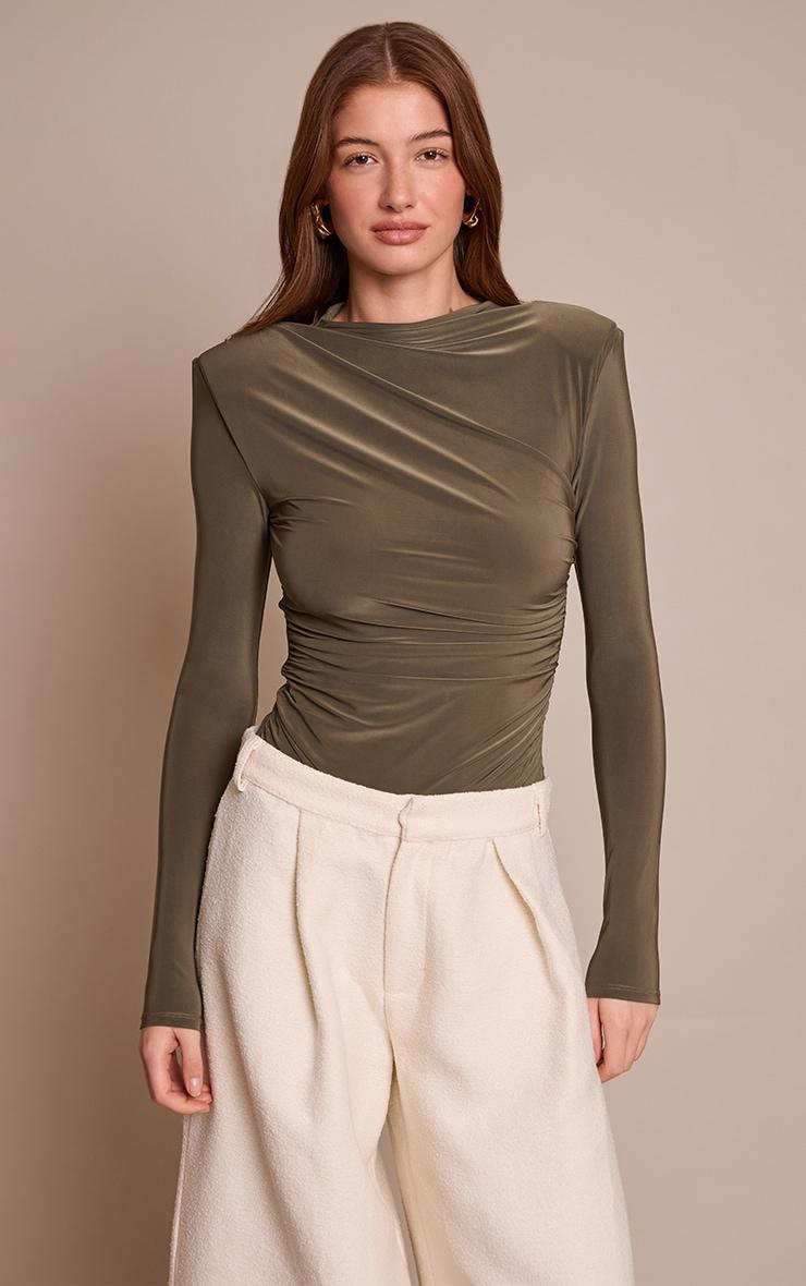 Own your presence in the khaki double layer slinky ruched drape detail long sleeve bodysuit. Its khaki finish boasts a double-layer and artful ruching, with a sophisticated drape. Ideal for elevated day plans. Pair with tailored pants, sharp kitten heels, and subtle gold bracelets for an assured look.Length approx 66cm/26inch (Based on sample size US 4)Model wears size UK 8/ EU 36/ AUS 8/ US 4Model Height - 5ft 9inchp]:!mb-4inch>Brand: PrettyLittleThingCategory: TopsProduct type: BodysuitColor: KhakiMaterial: Slinky JerseyNeckline: High NeckSleeves: LongOccasion: Day