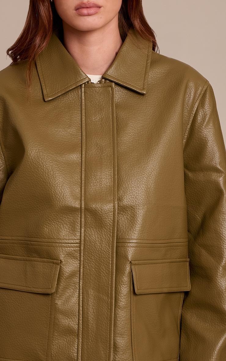 Command attention with ease. The khaki faux leather oversized jacket presents a relaxed yet refined cut, perfect for day. Its classic collar, sleek front zip, and functional patch pockets add a utility-inspired edge. Layer it over a ribbed knit and tailored wide-leg pants, then ground the look with heeled mules. Complete your ensemble with a touch of gold jewelry for an assured, fashion-forward presence that’s undeniably yours.Length approx 48.5cm/19inch (Based on sample size S)Model wears size SModel Height - 5ft 9inchp]:!mb-4inch>Brand: PrettyLittleThingCategory: OuterwearProduct type: Biker JacketColor: KhakiMaterial: Faux LeatherOccasion: Day