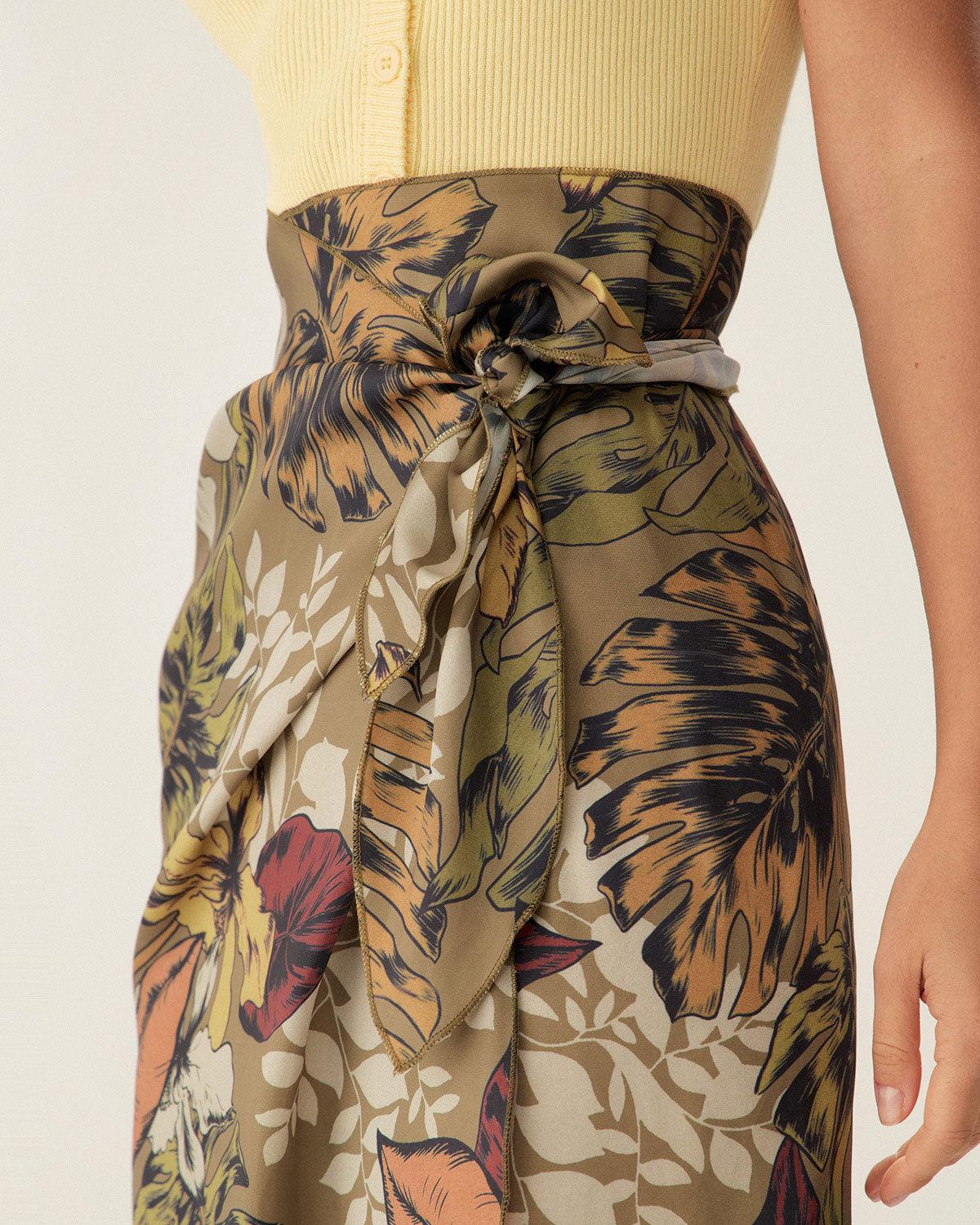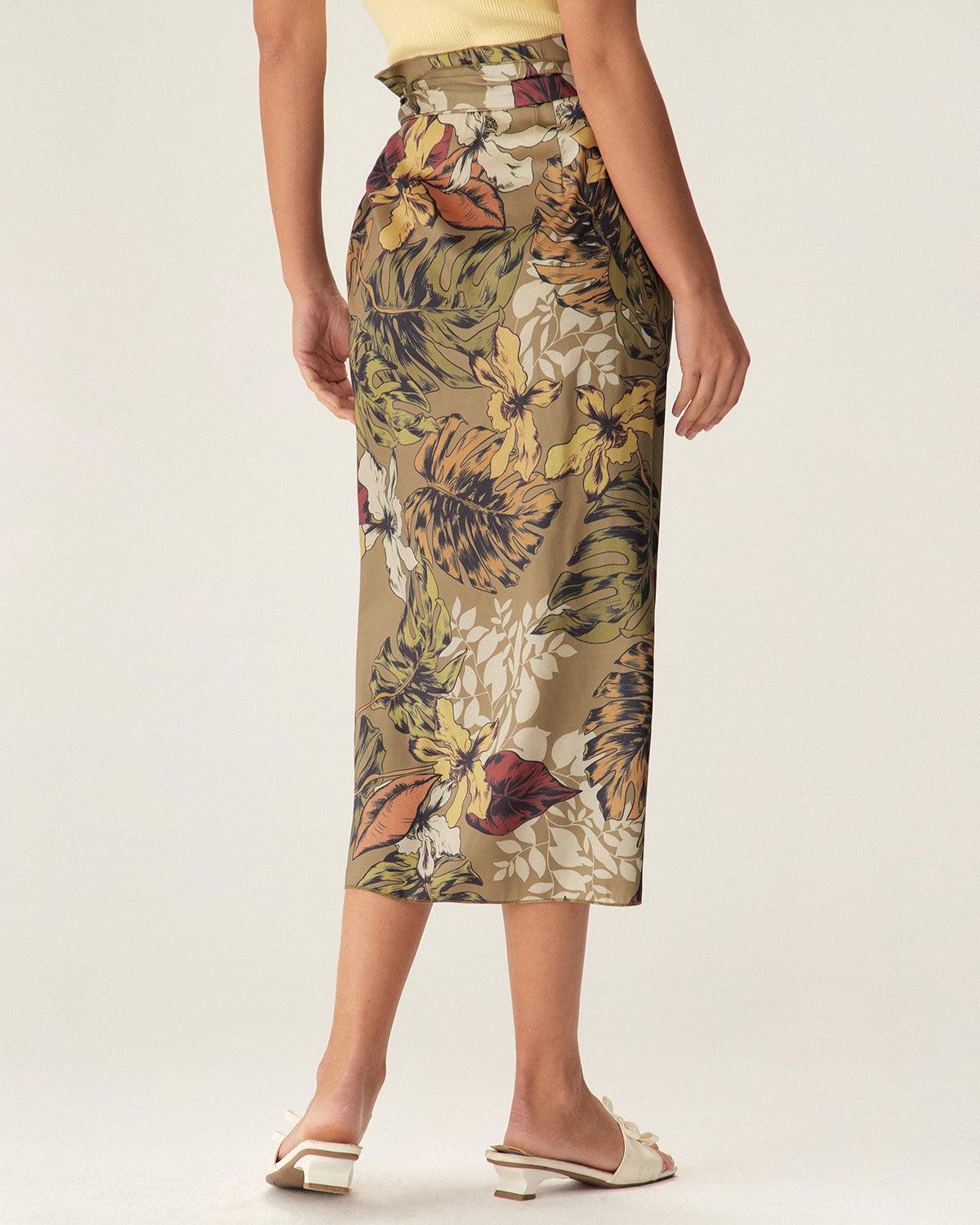 Khaki Floral High Waisted Wrap Midi Skirt