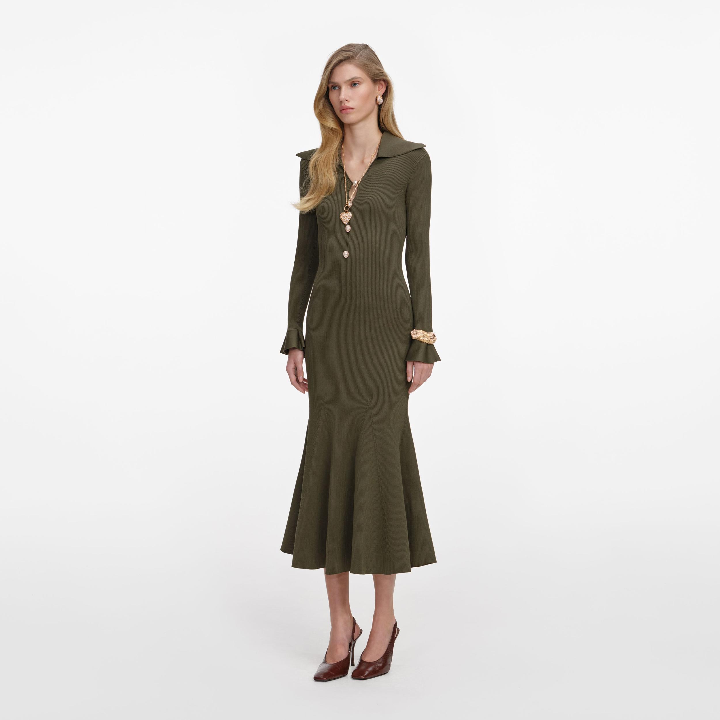 Framed by an oversized collar, this pointelle knit midi dress allows you to dress up in comfort. Gold buttons accent the bold keyhole cut-outs down the front – add heels for a sweeping entrance.True to sizeFabric has stretchButton closure down frontFlared hemGold buttonsModel is 5ft10/178cm and wears a size S