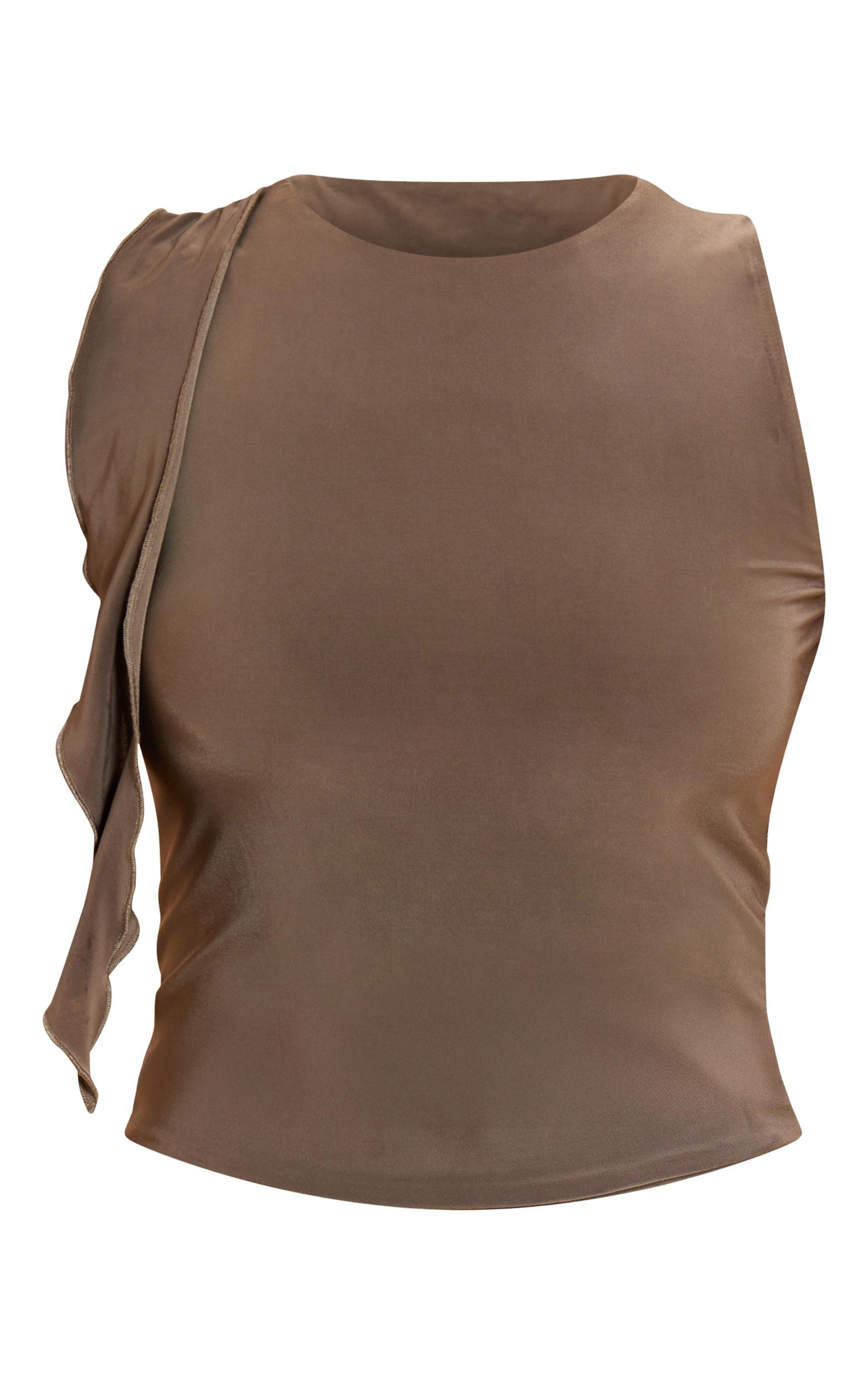 Craft an evening ensemble with an undeniable edge. The khaki slinky ruffle detail top presents a confident, close-fitting silhouette, featuring a sleek round neckline and an artfully draped ruffle panel that extends from one shoulder down the side, introducing subtle movement. Paired seamlessly with its matching mini skirt, this two piece set creates a contemporary statement for any night out. Finish the look with sharp court heels and a stack of gold bracelets for an elevated, self-assured aesthetic that captures attention effortlessly.Length approx 48.5cm/19inch (Based on sample size US 4)Model wears size UK 8/ EU 36/ AUS 8/ US 4Model Height - 5ft 9inchp]:!mb-4inch>Brand: PrettyLittleThingCategory: Co-ordsProduct type: Vest TopColor: KhakiMaterial: Slinky JerseyOccasion: Evening