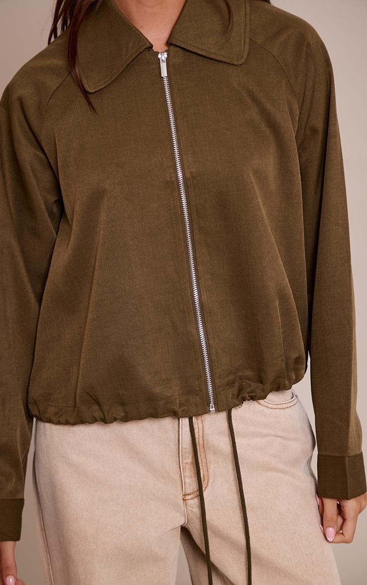 Introduce an urban edge with the khaki utility style draw cord bomber jacket. Made from khaki woven fabric, this bomber silhouette includes draw cord details for a utilitarian feel. Team with cargo pants and sneakers for a contemporary casual outfit.Length approx 48.5cm/19inch (Based on sample size S)Model wears size SModel Height - 5ft 7inchp]:!mb-4inch>Brand: PrettyLittleThingCategory: OuterwearProduct type: BomberColor: KhakiMaterial: TwillOccasion: Day