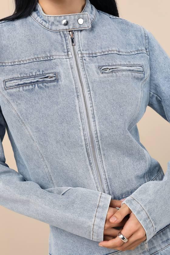 Cool girl-certified and ready for adventure, this light wash denim jacket features a lightweight fabrication and a moto-inspired silhouette that always reads iconic. Long sleeves (with zippered cuffs) frame the collarless bodice that features snap button closures that secure atop the center zipper. Twin zipper pockets complete the design. Pair with the matching skirt for a complete look!